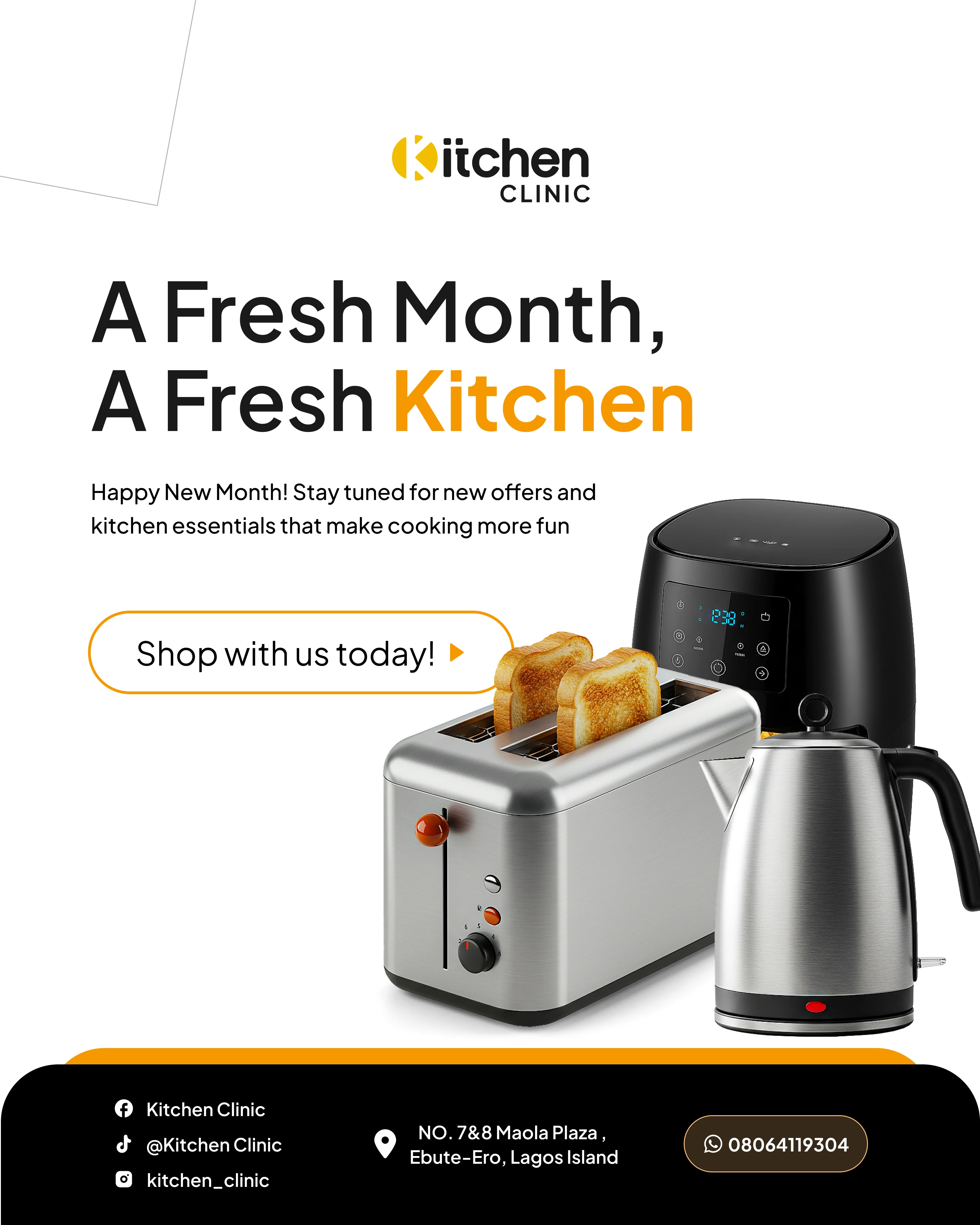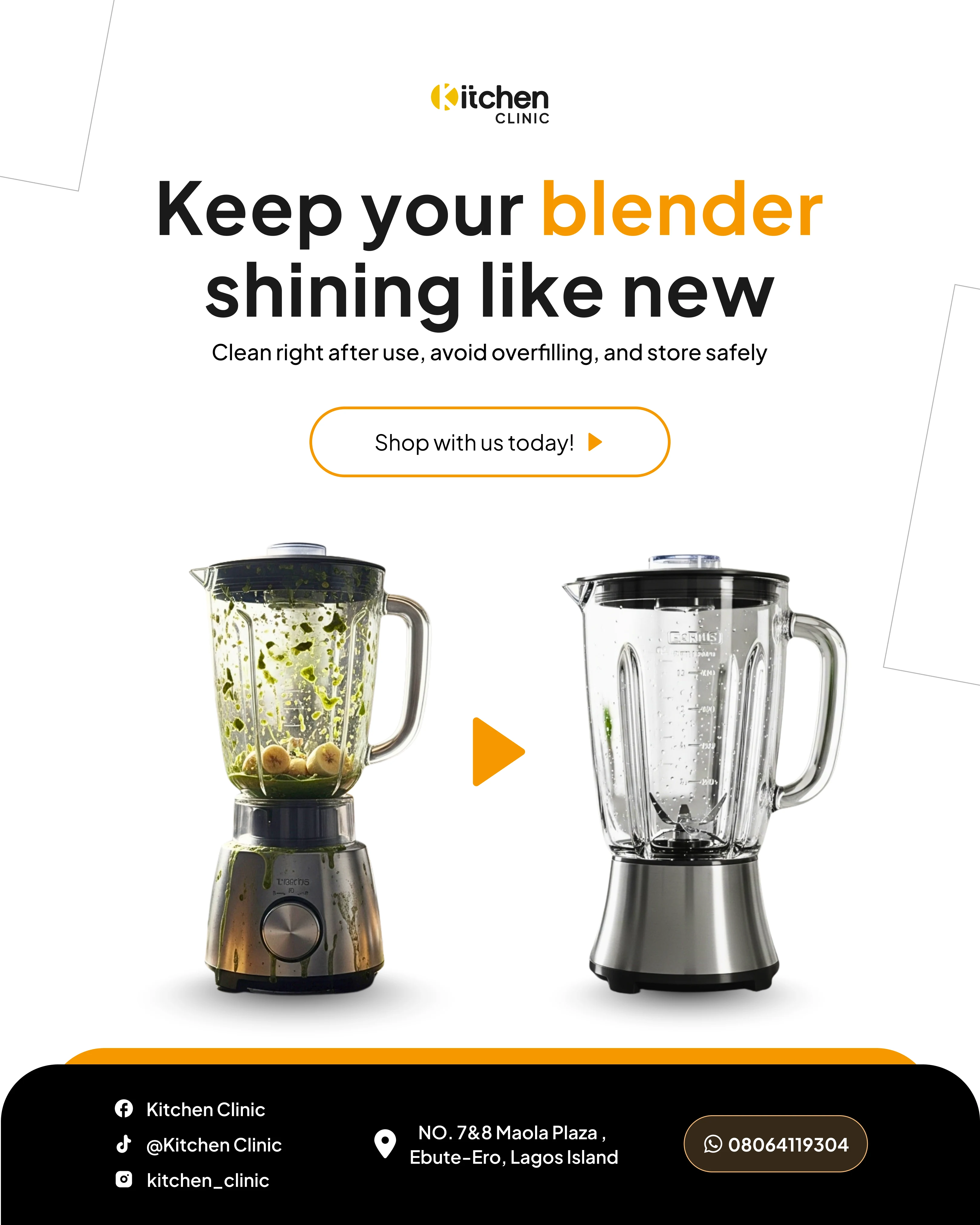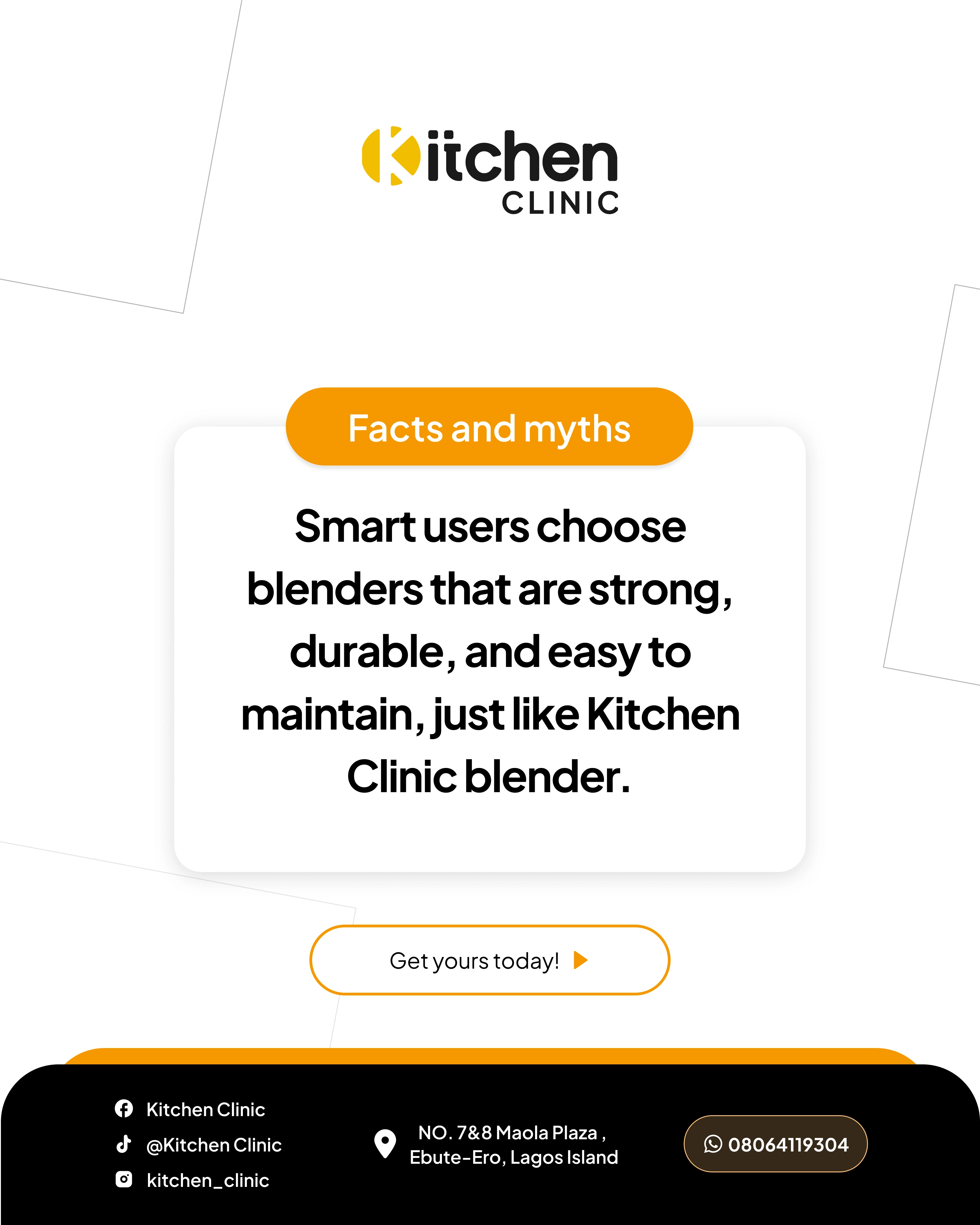 Project Description: Kitchen Clinic - Multi-Product Ad Campaign The Client: Kitchen Clinic, a retailer specializing in high-quality kitchen appliances (blenders, toasters, kettles). The Goal: To design a cohesive and engaging set of digital flyers and social media assets to drive immediate sales and improve brand perception of quality and reliability. My Solution (Creative Strategy): Brand Consistency: Maintained a clean, modern aesthetic with a consistent orange/white/black color palette across all assets (blender, toaster, kettle ads). Highlighting Benefits: Used clear, benefit-driven headlines (e.g., "Keep your blender shining like new," "Durable, easy to clean, affordable"). Visual Hierarchy: Used dynamic layout angles and bold product placement to draw the eye to the hero product (the blender) and key information (contact, address, CTAs). Clear CTAs: Incorporated immediate "Shop with us today!" and phone number placement for conversion tracking.