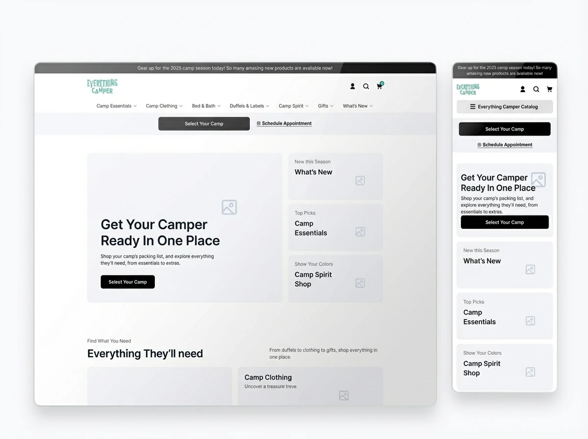 Everything Camper needed a complete wireframe system for a new eCommerce experience that supports customizable camp packing lists, product bundles, and parent-friendly shopping flows. I designed a complete set of mobile-first wireframes covering navigation, product discovery, selection, cart preview, onboarding, and checkout.