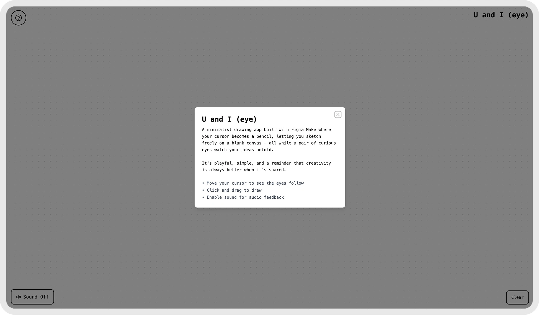 A minimalist drawing app built with Figma Make, where your cursor becomes a pencil, letting you sketch freely on a blank canvas — all while a pair of curious eyes watch your ideas unfold.
