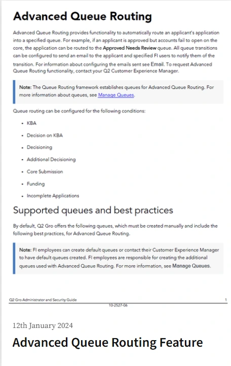 A feature guide written for a financial services client, providing staff with a complete overview of the Advanced Queue Routing feature. It covers the feature’s purpose, configuration options, workflow, and expected behavior within the core banking system and the customer’s online banking experience. The guide supports staff in handling customer requests by enabling them to create and manage custom loan application queues that automatically route submissions based on the settings requested by the customer.