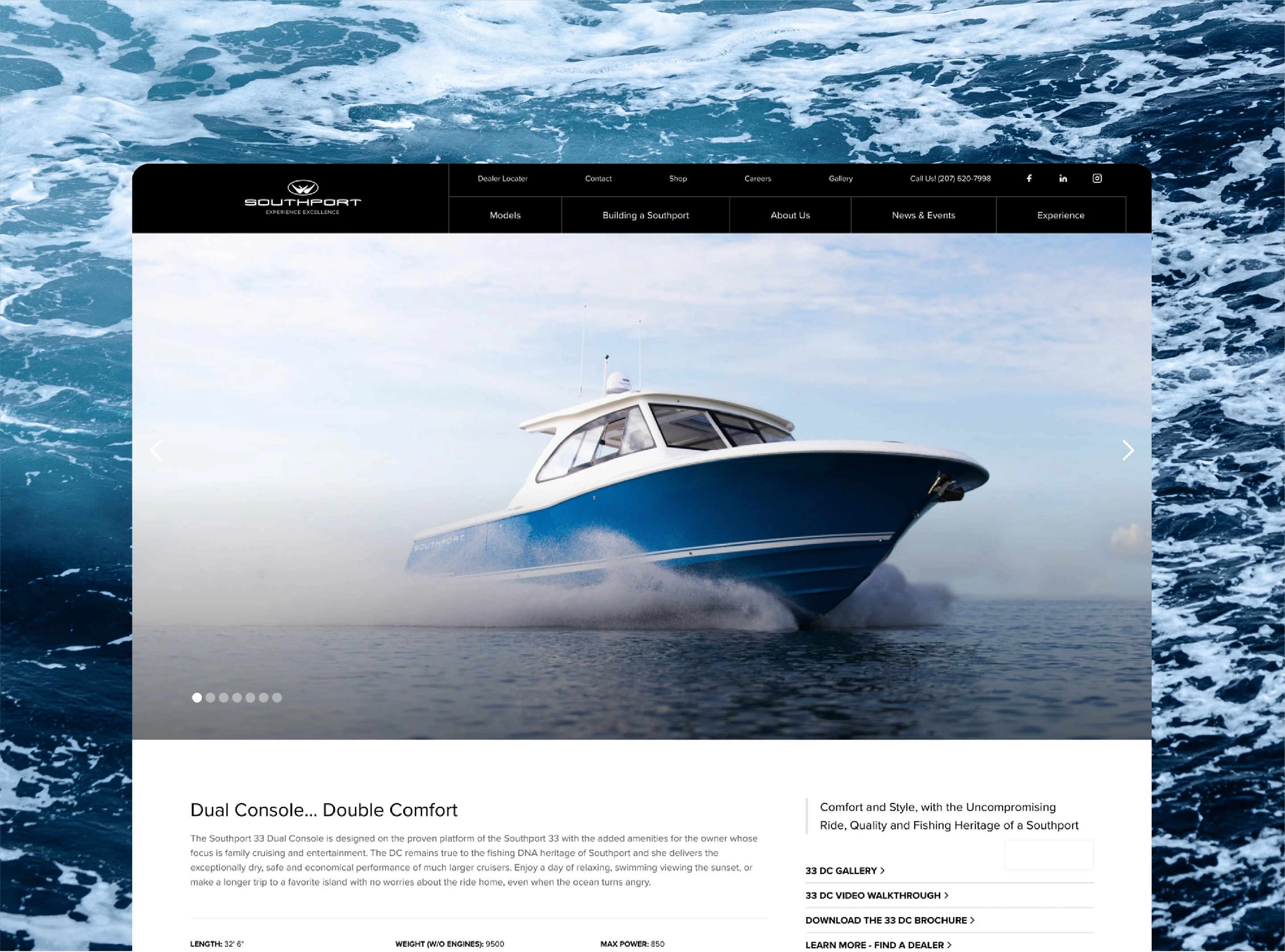 Luxury boat manufacturer website designed in Webflow with immersive product showcases, responsive layouts, and CMS-powered dealer locator.