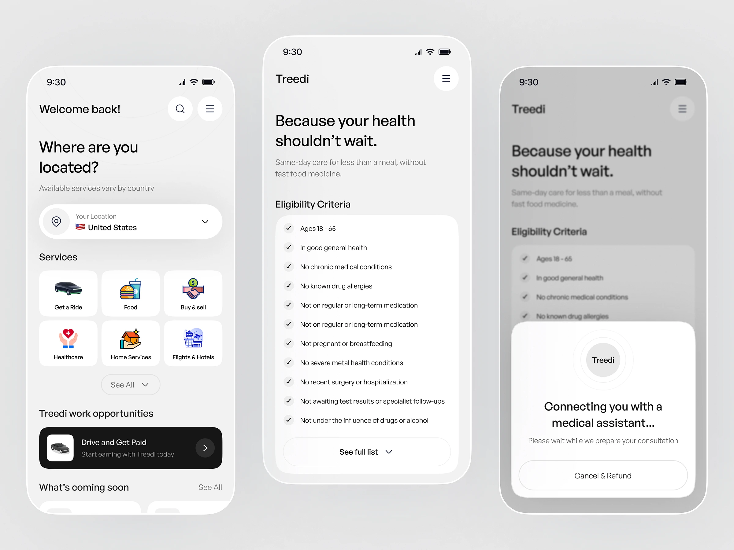 An on-demand healthcare app that connects users with medical assistance in real time, featuring eligibility checks, location-based services, and a seamless, trust-first user experience.