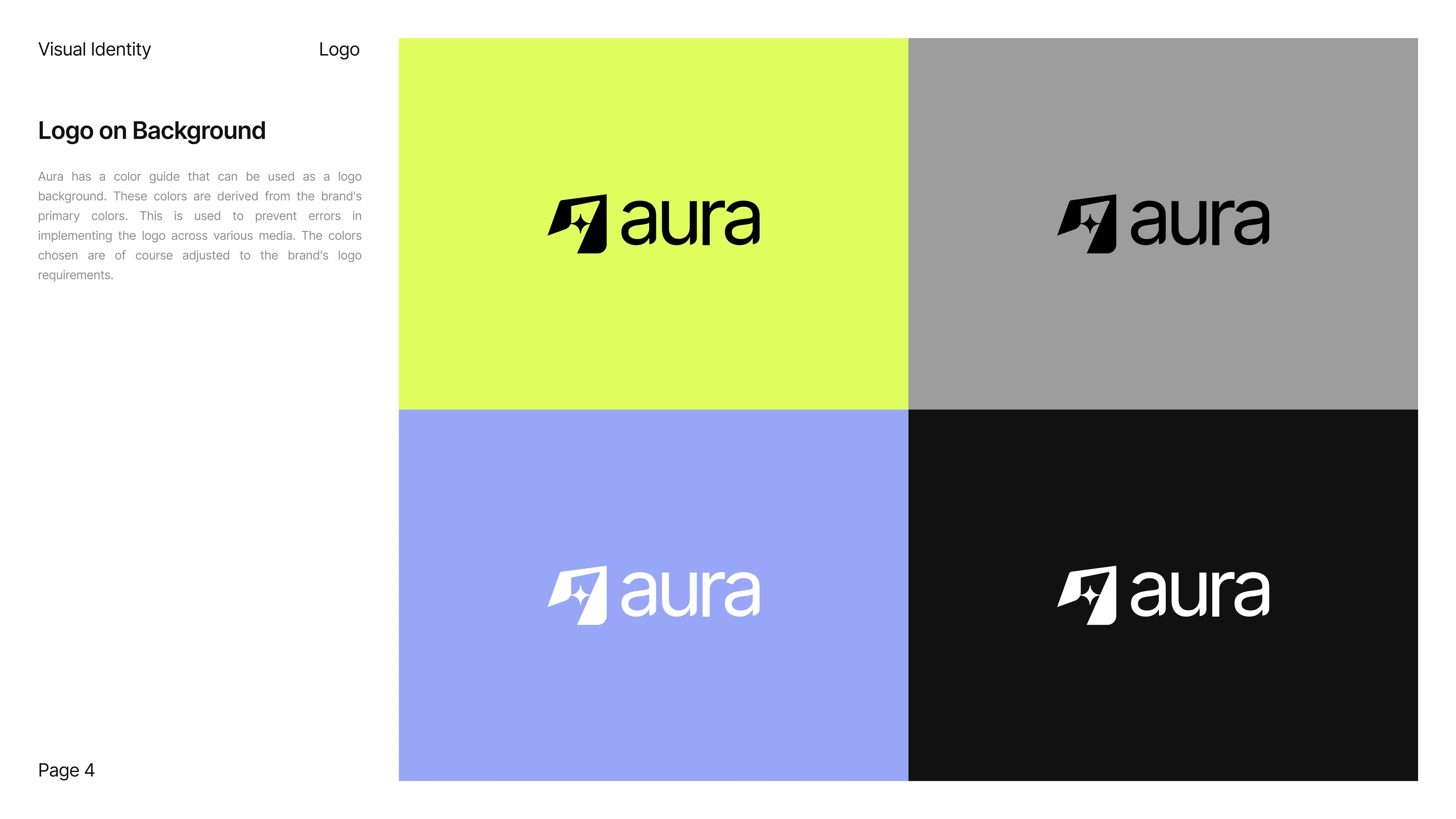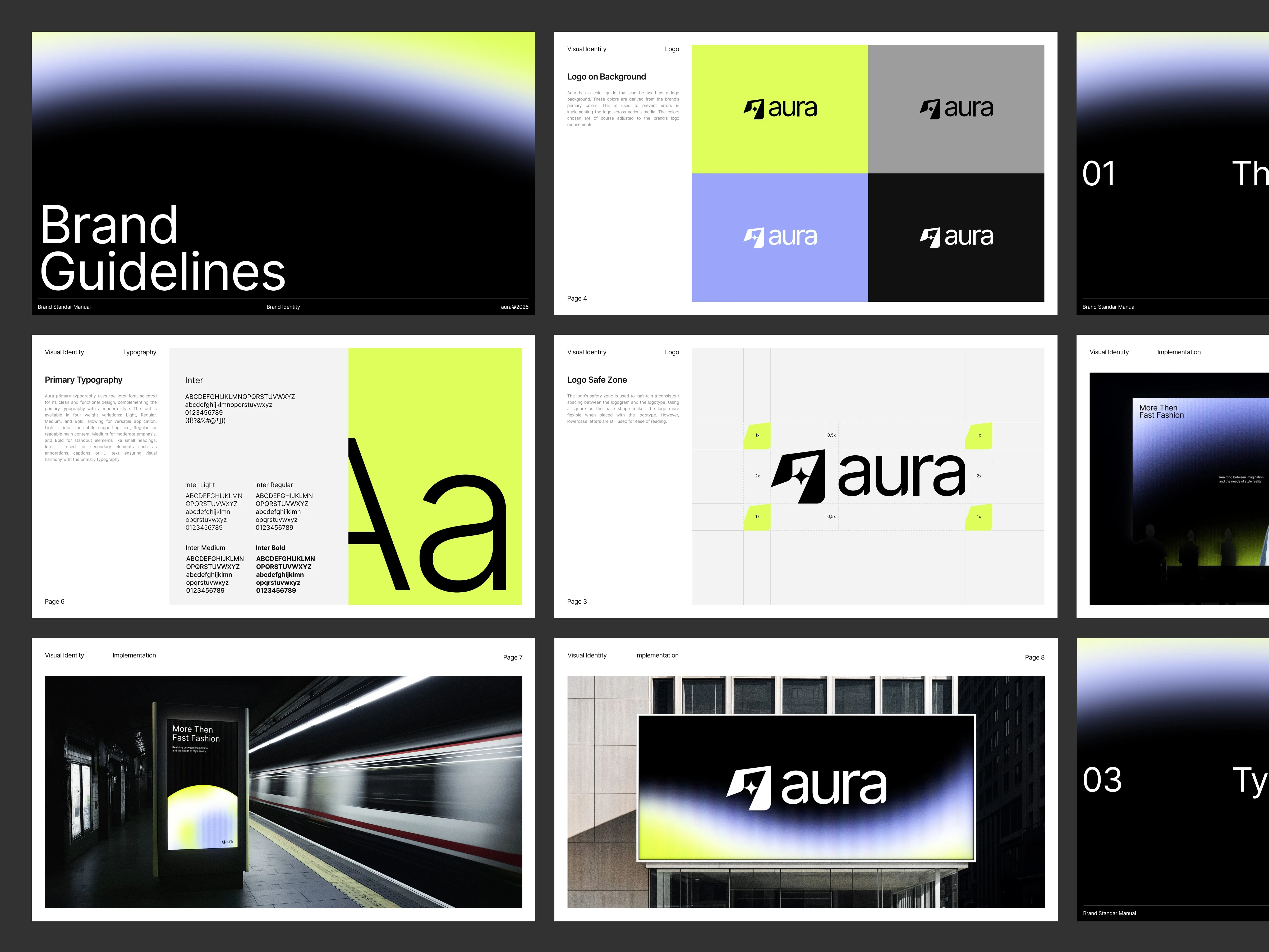 Aura is a vibrant brand identity built to express energy, innovation, and modern simplicity. Designed as a visual system that blends motion, light, and clarity, Aura captures the intersection between futuristic aesthetics and functional design. The brandbook establishes a consistent visual framework defining logo behavior, color application, typography, and implementation across multiple touchpoints, from billboards to digital interfaces.
