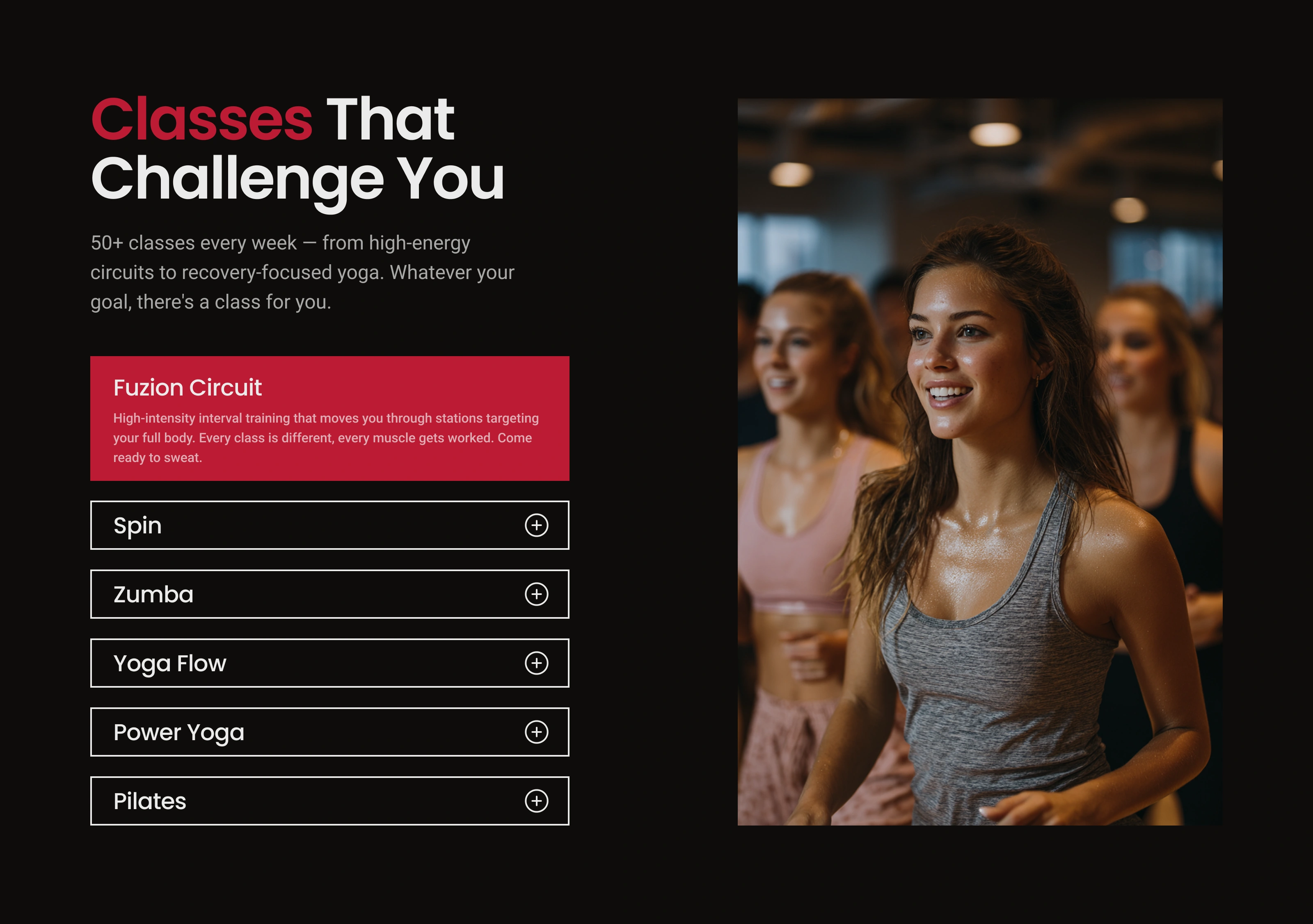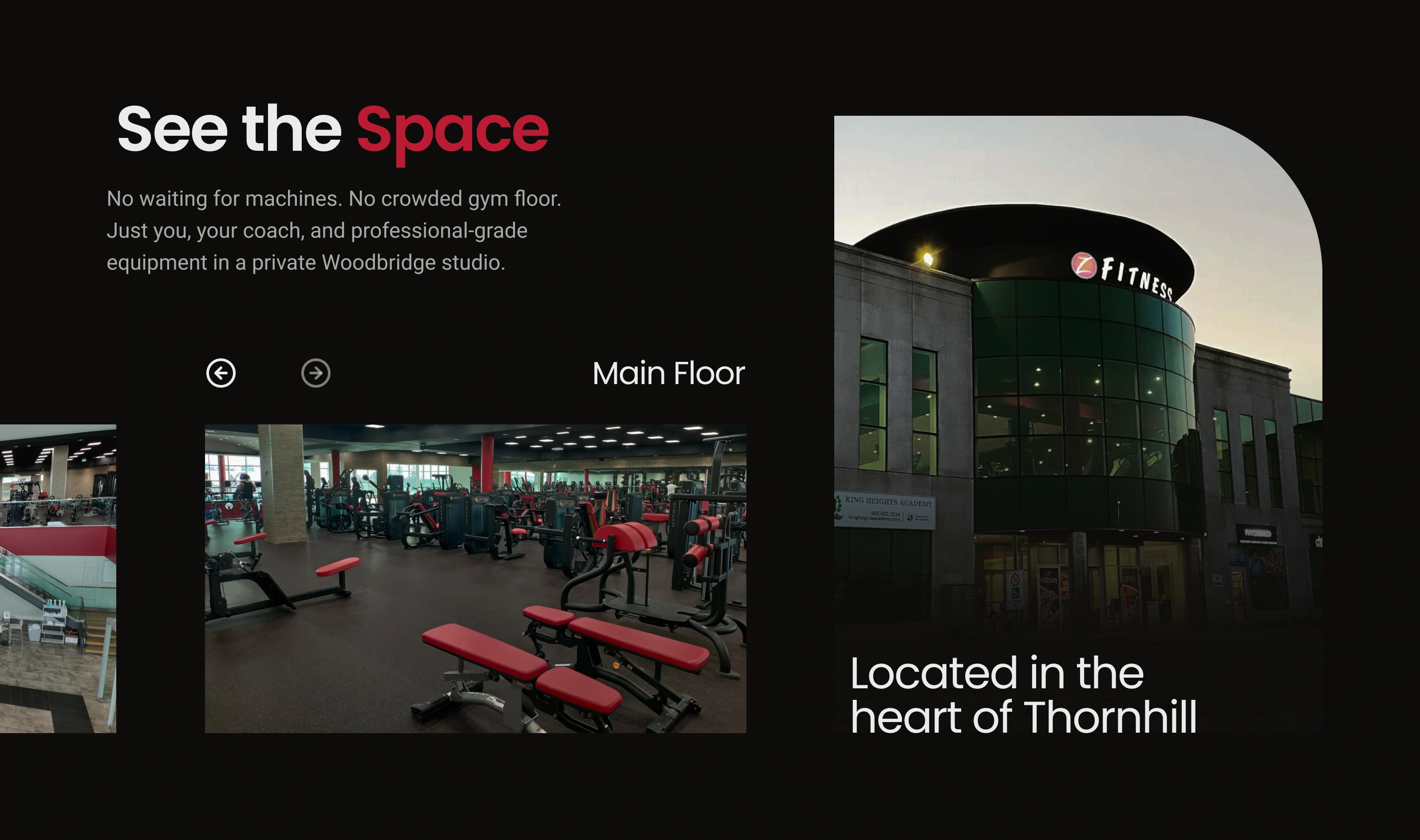 Gym homepage redesign for a Thornhill fitness studio. Dark UI, facility photos, social proof front and center. Designed in Figma.