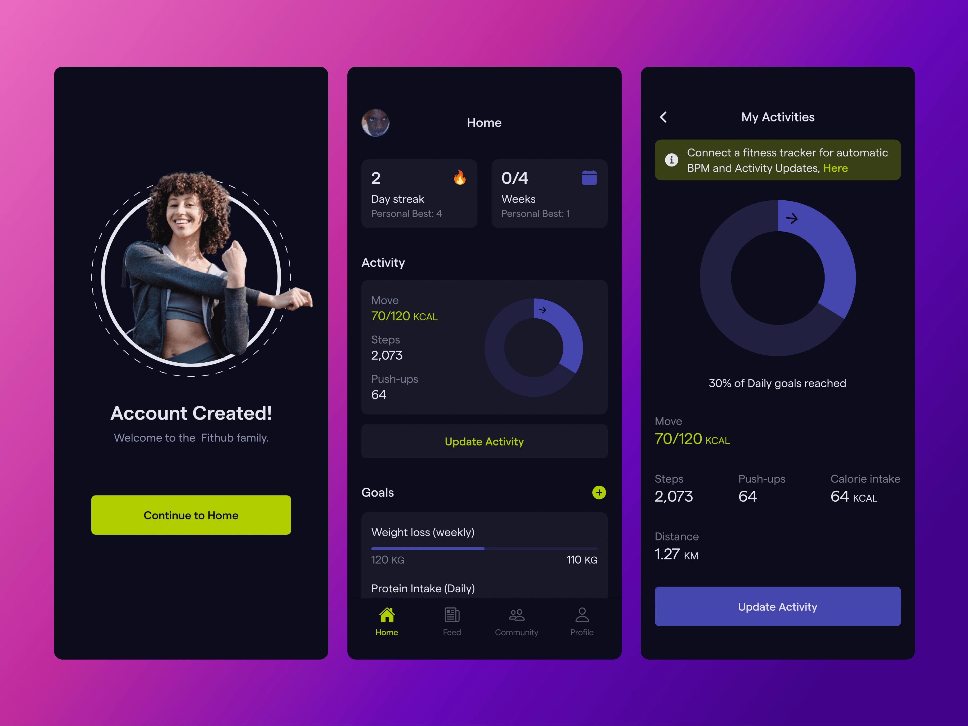 Designed FitHub, a dynamic fitness app that empowers gym-goers to track calories, set personalized goals, and build consistent workout streaks. The app fosters motivation with community groups for group activities, creating an engaging social experience while keeping users accountable. With an intuitive interface and seamless user flow, FitHub makes fitness tracking effortless and fun! 💪📱