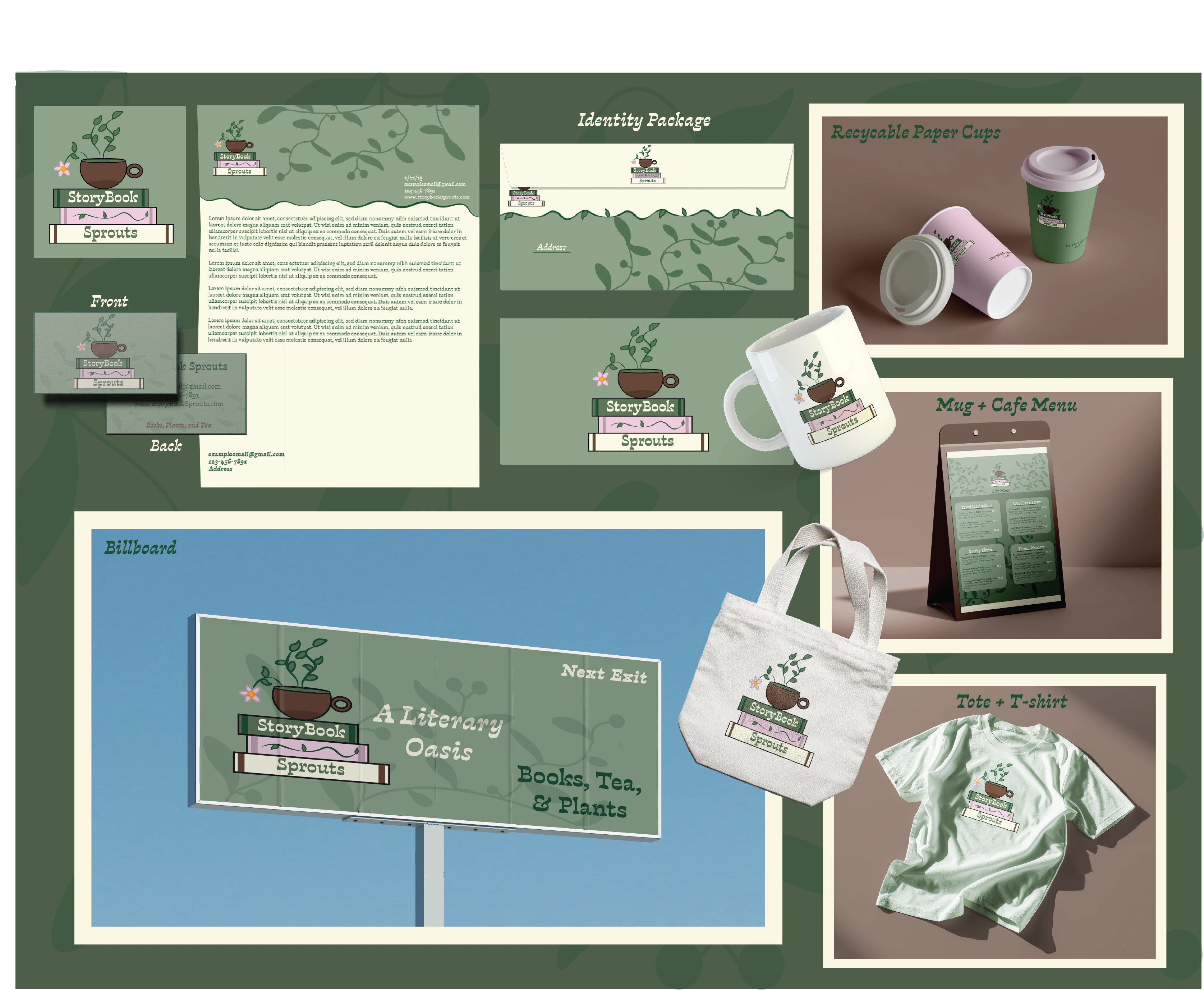 StoryBook Sprouts is a branding concept for a nature-inspired bookstore and coffee shop. The logo blends a sprouting coffee cup with stacked books to reflect the brand’s cozy, creative vibe. A soft, earthy color palette and organic typography help evoke calm and curiosity, appealing to readers, plant lovers, and coffee enthusiasts alike.