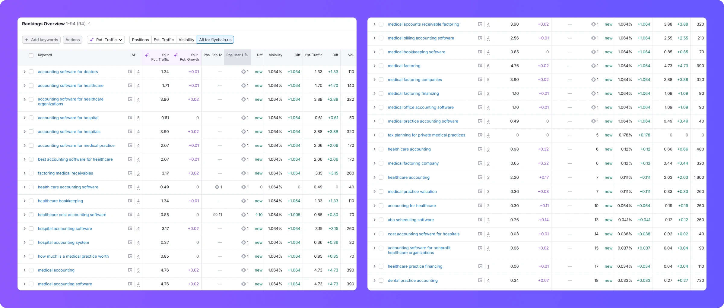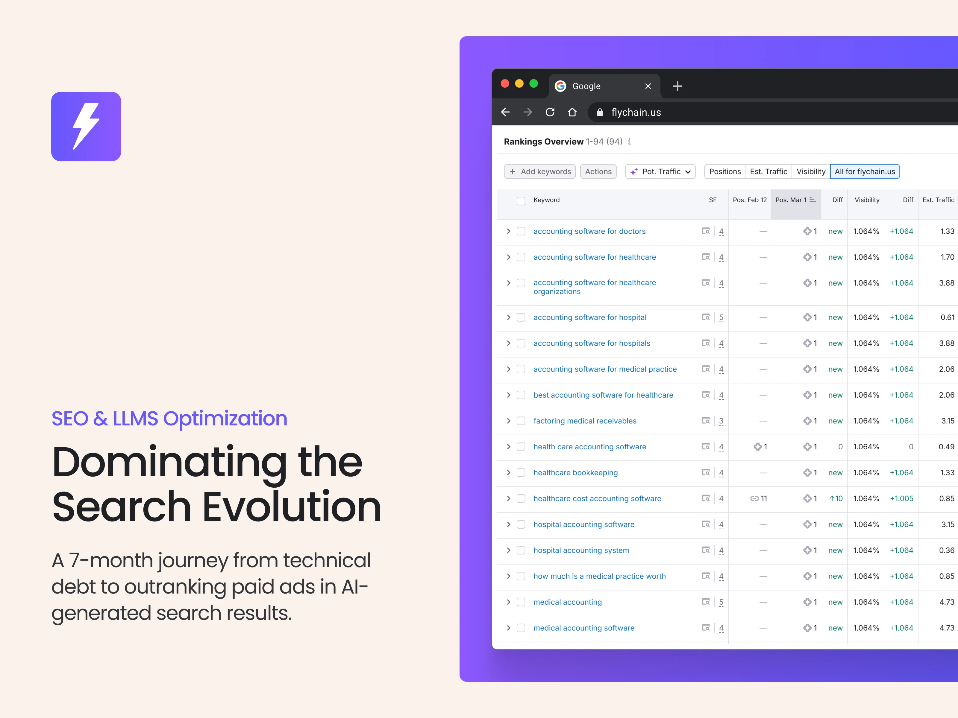 Flychain, a healthcare financial SaaS provider, struggled with a digital presence that had flatlined after a year with a previous agency. Despite the competitive nature of the niche, their site was riddled with technical friction, a lack of LLM-readiness, and invisible "intent-based" content, allowing high-spending competitors to dominate the market share.
