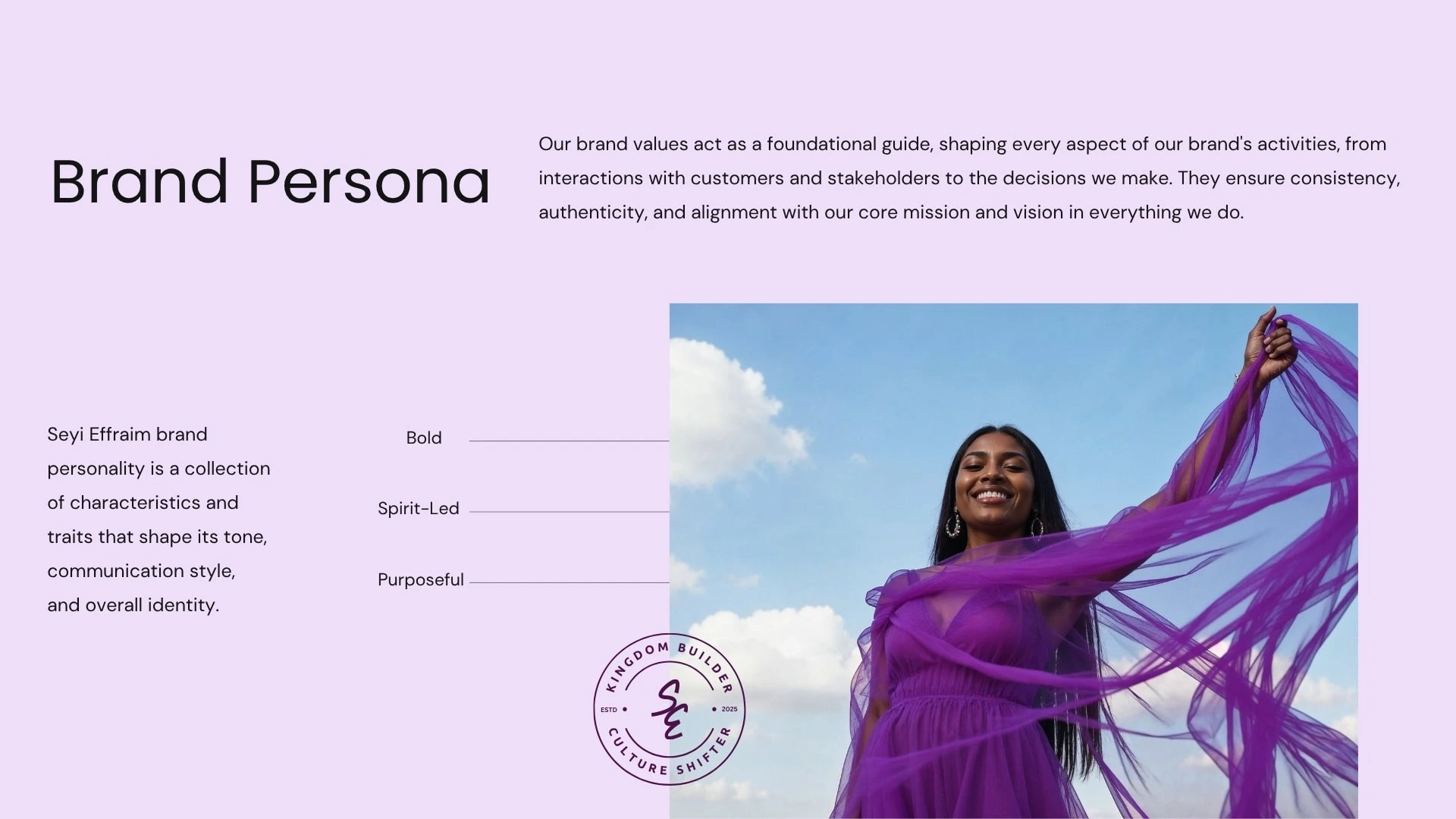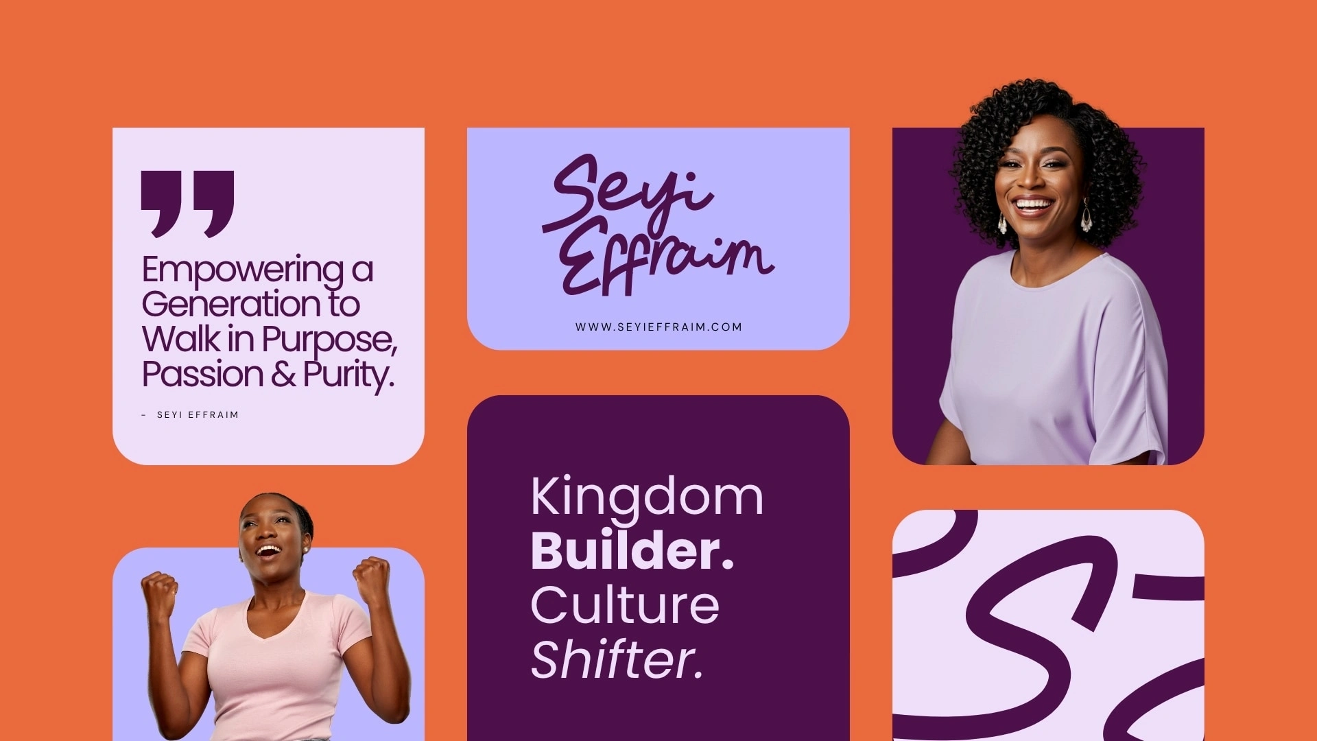 Seyieffraim is a faith-driven personal brand led by Seyi Effraim — a “Kingdom Builder, Culture Shifter, and Empowerer of Purpose.” The goal of this project was to develop a distinct, modern, and feminine brand identity that communicates her calling, message, and presence with visual clarity and confidence.