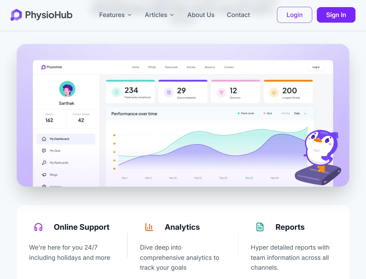 The platform features a clean, responsive interface with interactive flashcards, timed quizzes, and personalized dashboards. Built with a focus on usability and performance, the system ensures smooth navigation and fast load times across all devices. Users can effectively master physiotherapy skills through a streamlined and engaging learning experience anytime, anywhere.