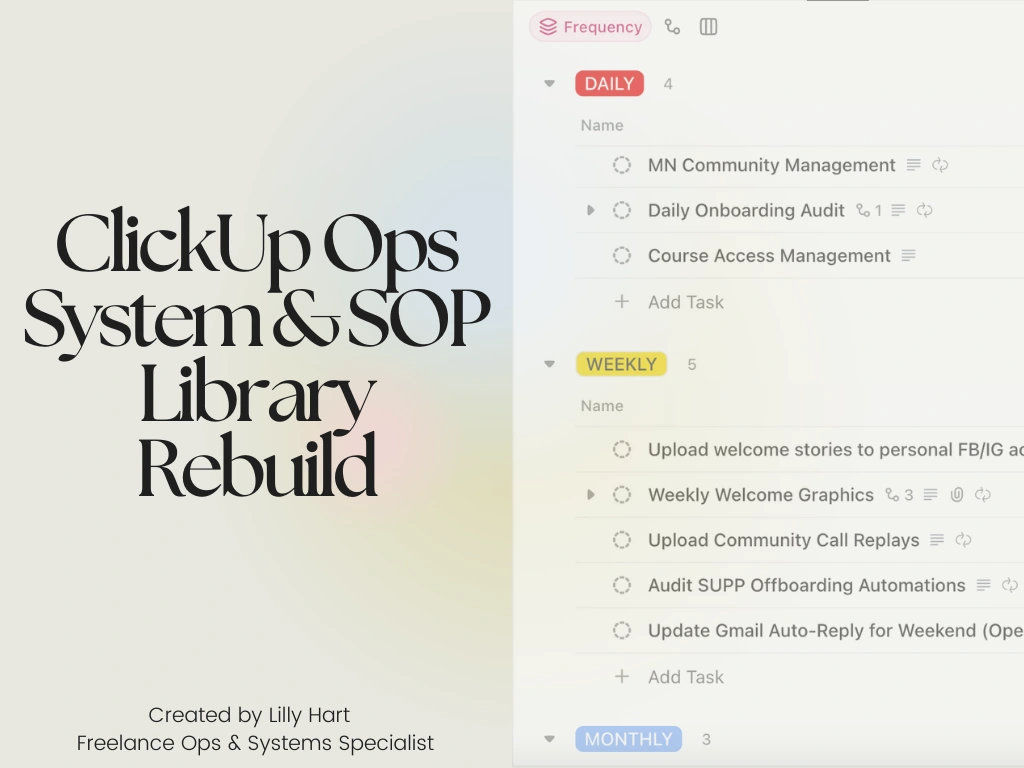 Rebuilt a client’s ClickUp operations system, rewriting workflows and SOPs and adding Loom documentation to support scalable, async execution.