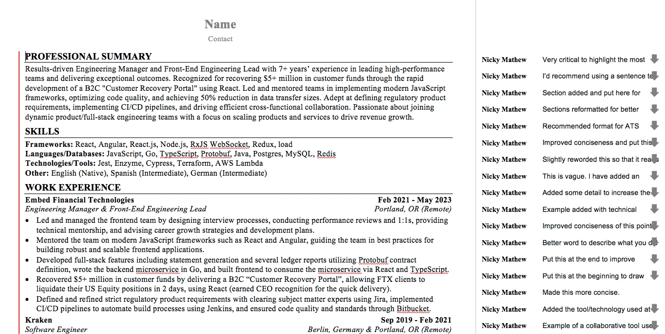 Full-line edit and rewrite of a Software Engineering Lead resume with tracked changes, comments, and suggestions.