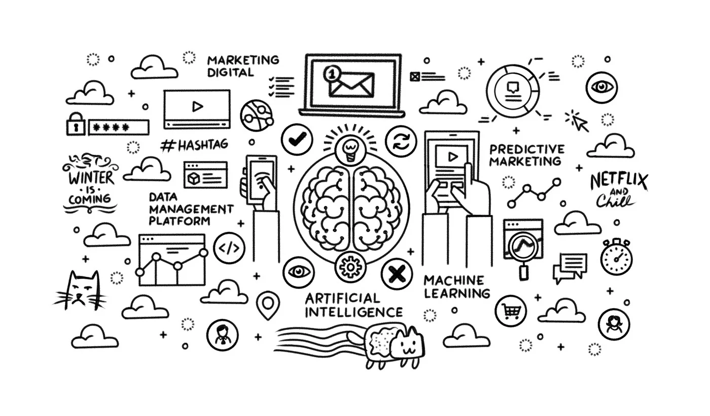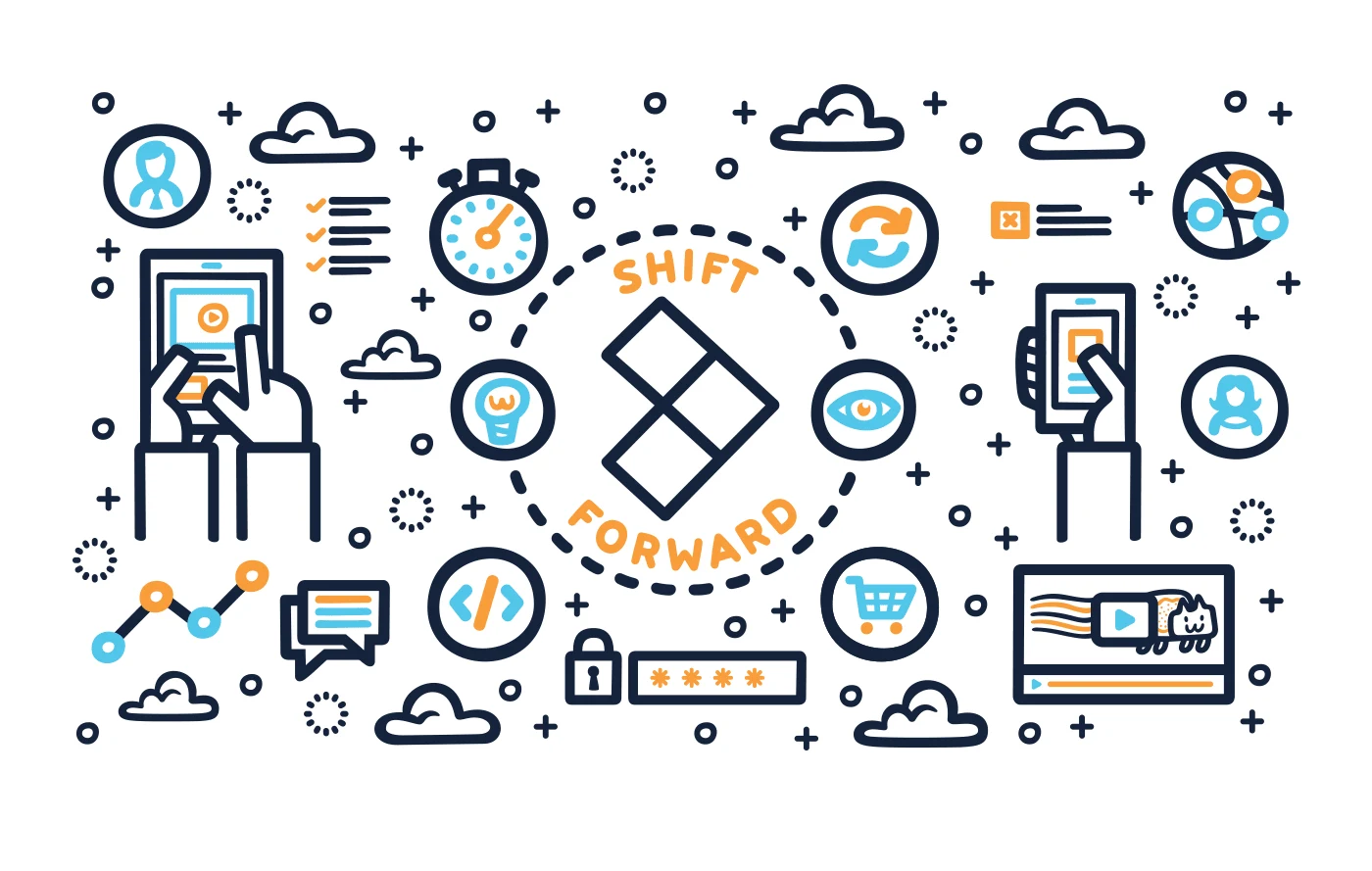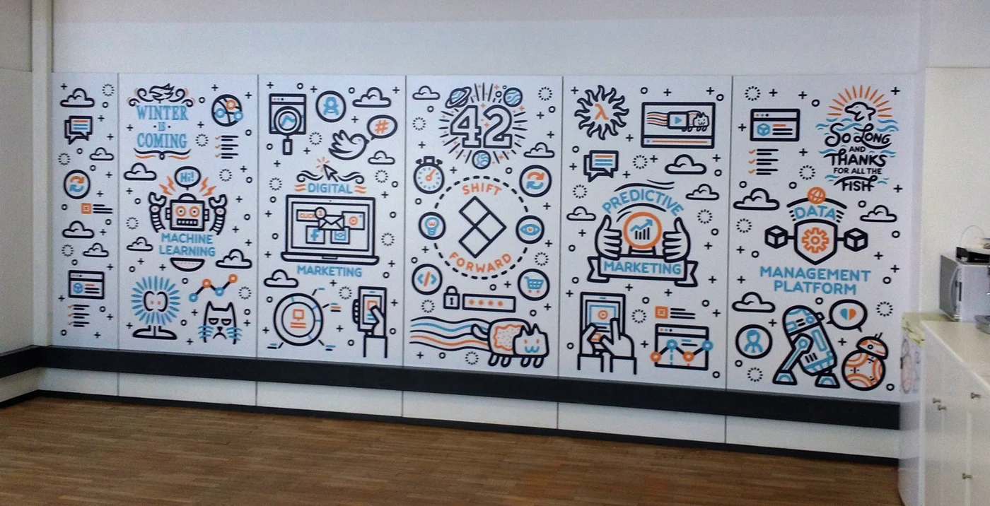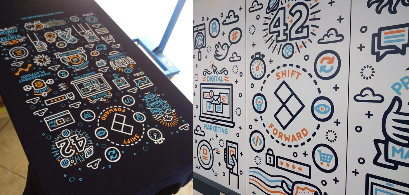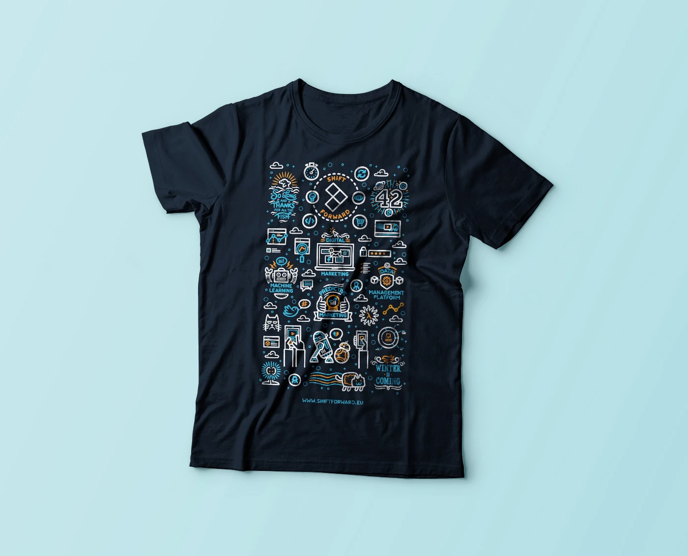 Shift Forward is a technological startup from Porto, Portugal, who offers products that solve digital advertising big data pain points. They wanted to decorate a wall in their office with an illustration that reflected, in a fun way, the company philosophy and main areas of business mixed with a bunch of pop culture references selected by the team members. The illustration should also be applicable into a t-shirt.