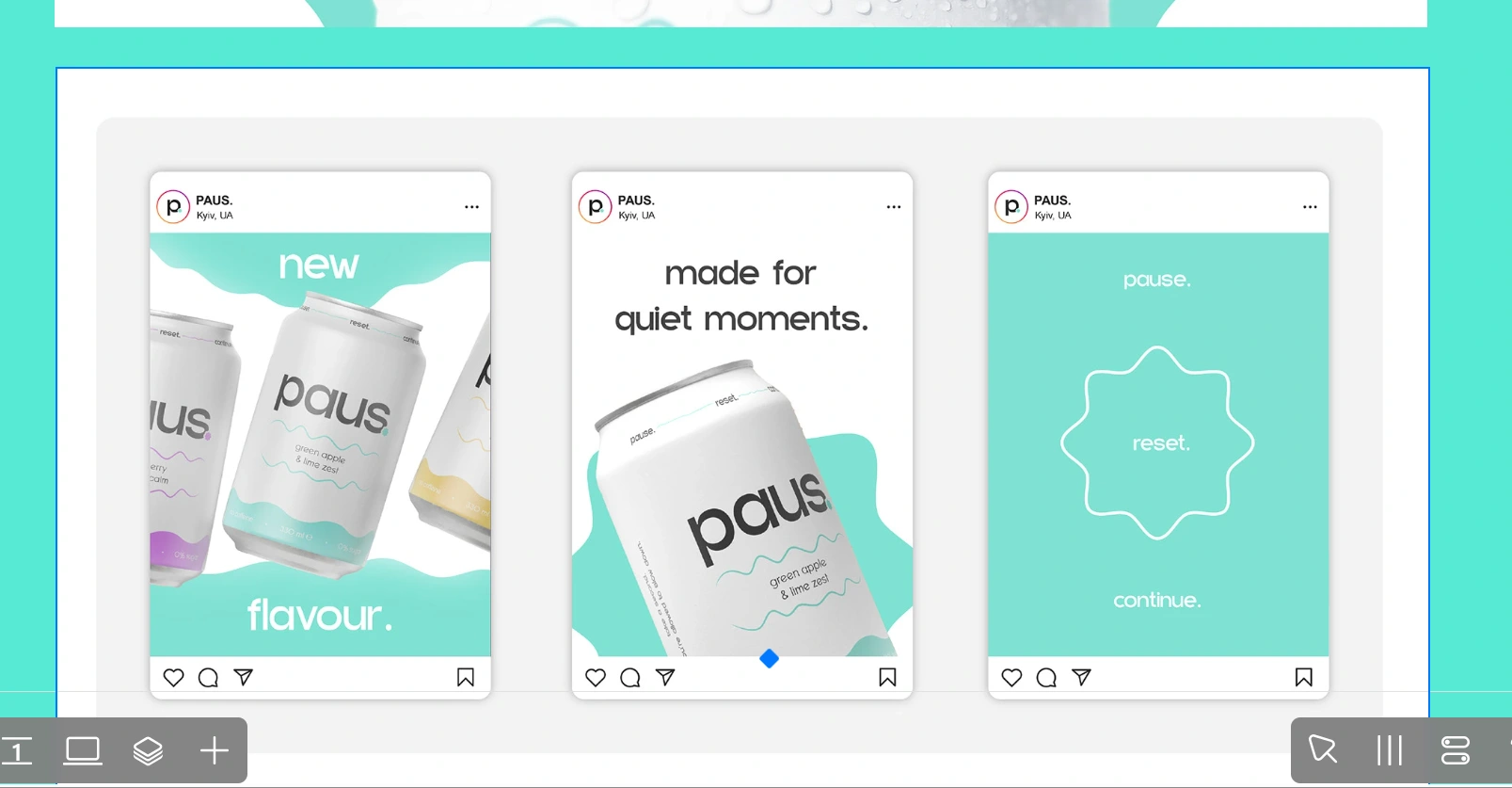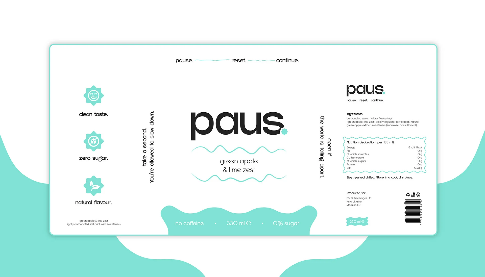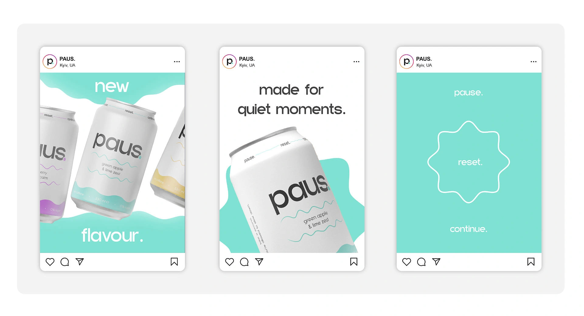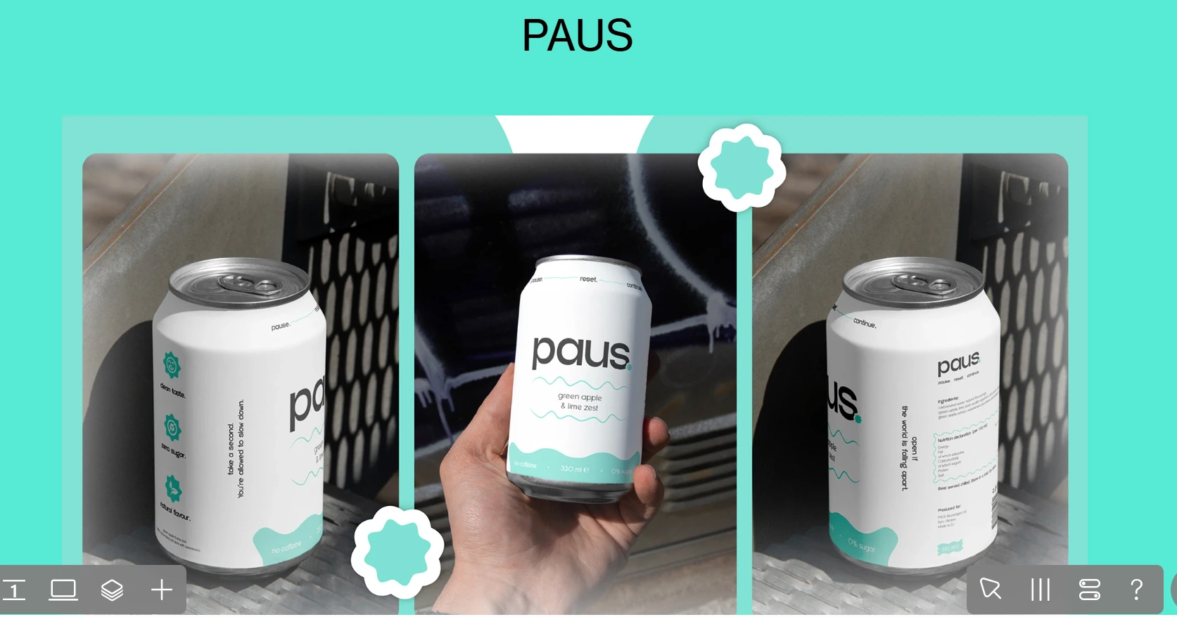 PAUS is a modern soda brand concept centered around calm, balance, and mindful consumption. The project involved developing a cohesive brand identity and translating it into a visually engaging digital experience. Alongside packaging and visual direction, a responsive landing page was designed and built using Readymag, brand story and product in a clean, immersive way.