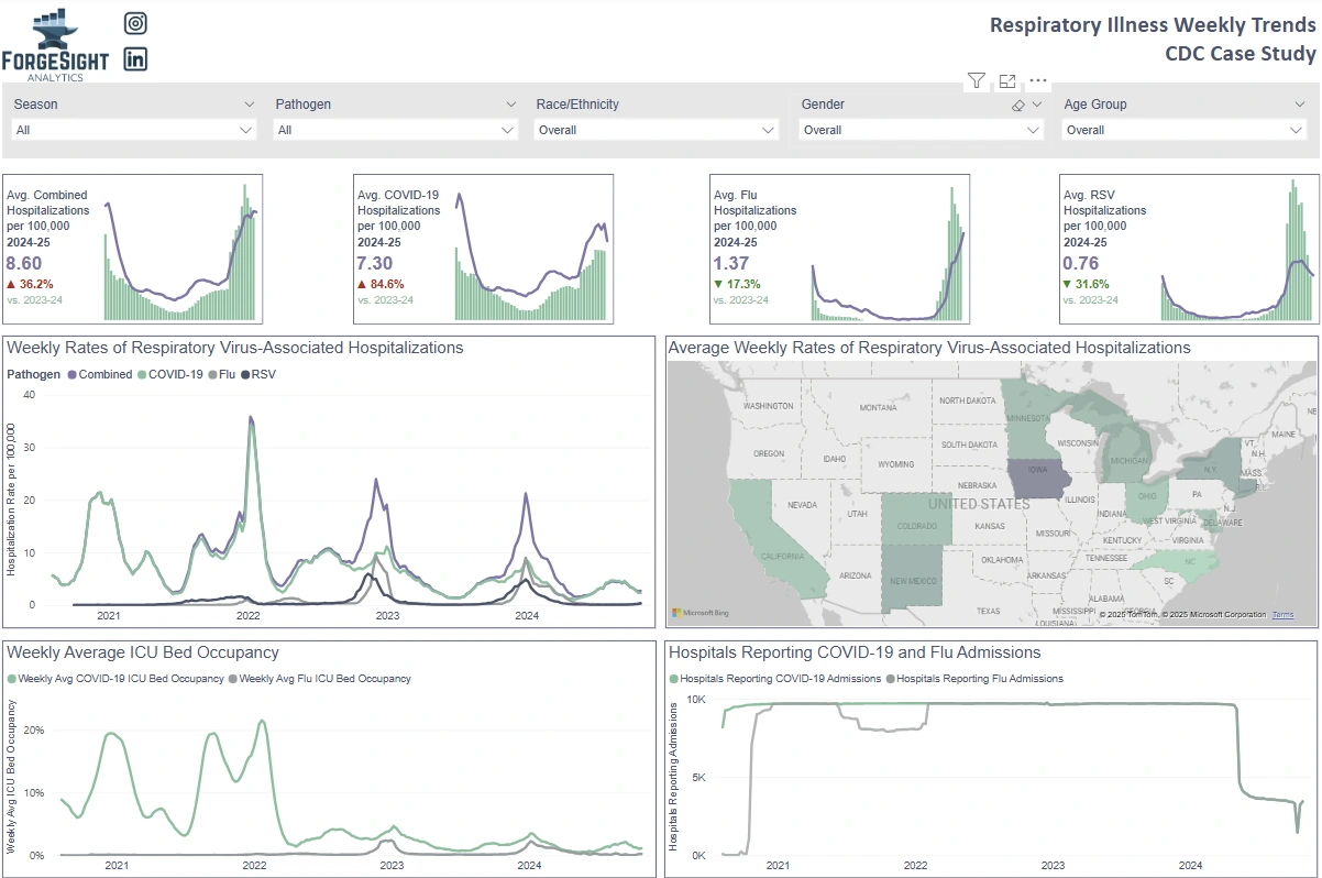 This interactive dashboard explores national respiratory illness trends using publicly available data from the CDC. It showcases ForgeSight Analytics’ ability to distill complex datasets into compelling visuals that highlight seasonal surges, demographic disparities, and pathogen-specific patterns.