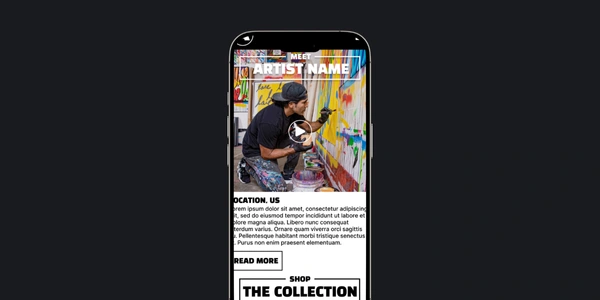 Mobile site for Arthouse collab featuring artist story, BOGO coupon, merch shop, and interactive art show map.