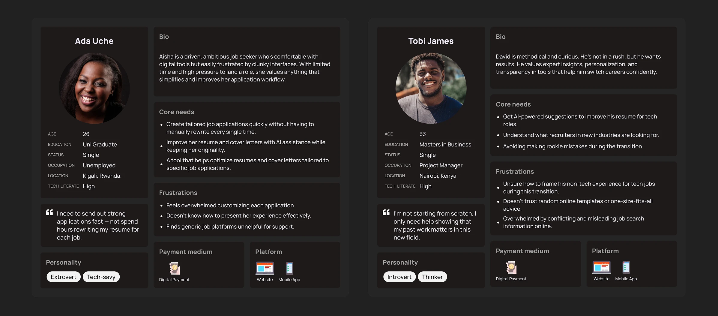 2. User Surveys & Personas: I created surveys targeting students and remote workers to understand their job application process, frustrations with current processes and tools, and wishlist features. I didn’t just come about these Personas through surveys alone. I had virtual interviews with 3 participants, and their stories led to the development of two primary personas: Aisha, the recent university graduate, and David, the Mid-Level Professional Pivoting Careers