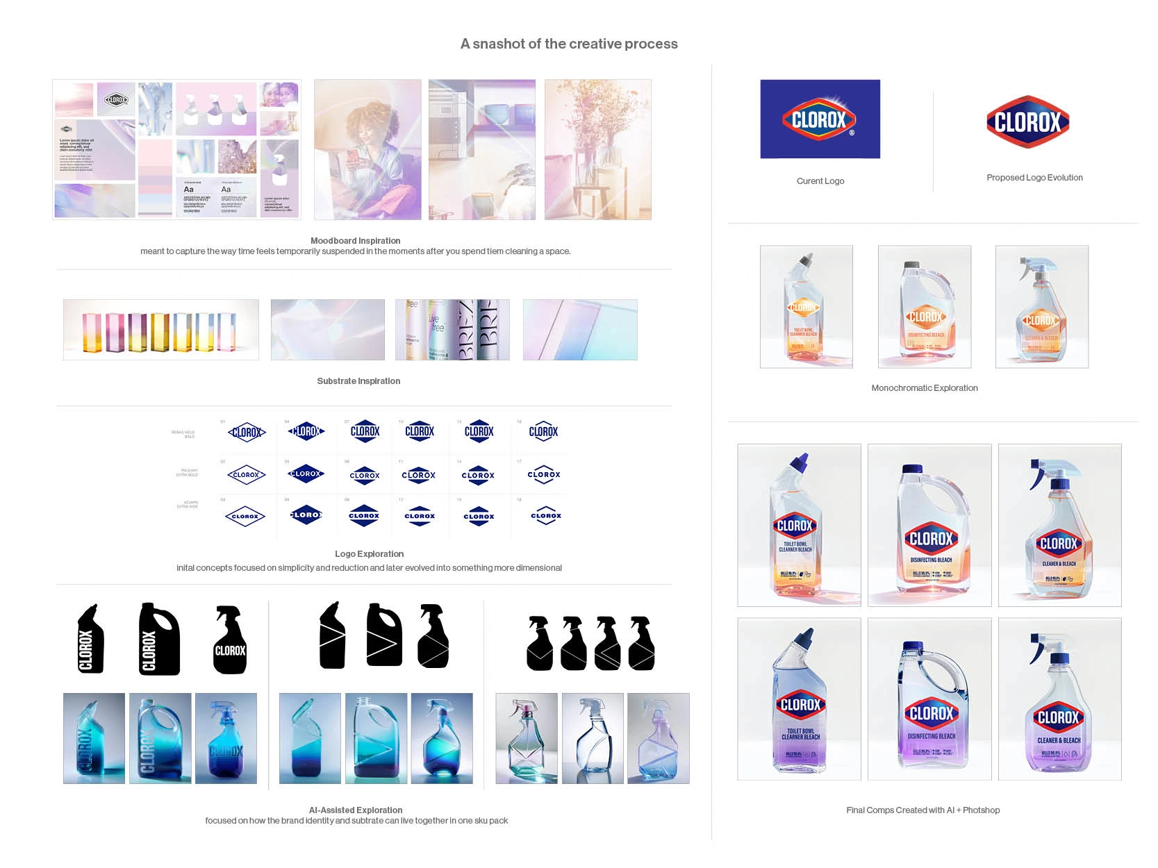 That idea led me to explore refracted light, translucency, and surface interaction as the core visual language for the system. I was interested in expressing the feeling of transformation not only through brand elements, but through the packaging substrate itself. The concept proposed a harder, acrylic-like materiality paired with soft gradients and light-driven color effects, allowing the liquid, surface, and graphics to work together to create an object that felt more dimensional, premium, and sensorial in the hand.