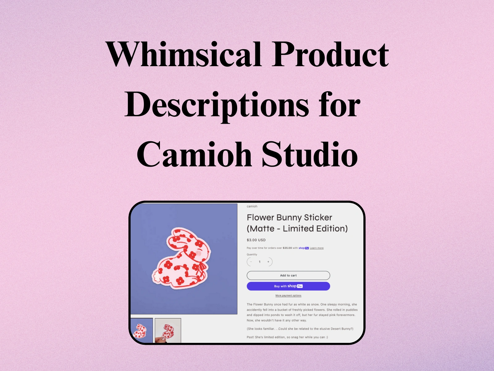 Finished Copy: The Flower Bunny once had fur as white as snow. One sleepy morning, she accidently fell into a bucket of freshly picked flowers. She rolled in puddles and dipped into ponds to wash it off, but her fur stayed pink forevermore. Now, she wouldn’t have it any other way.
