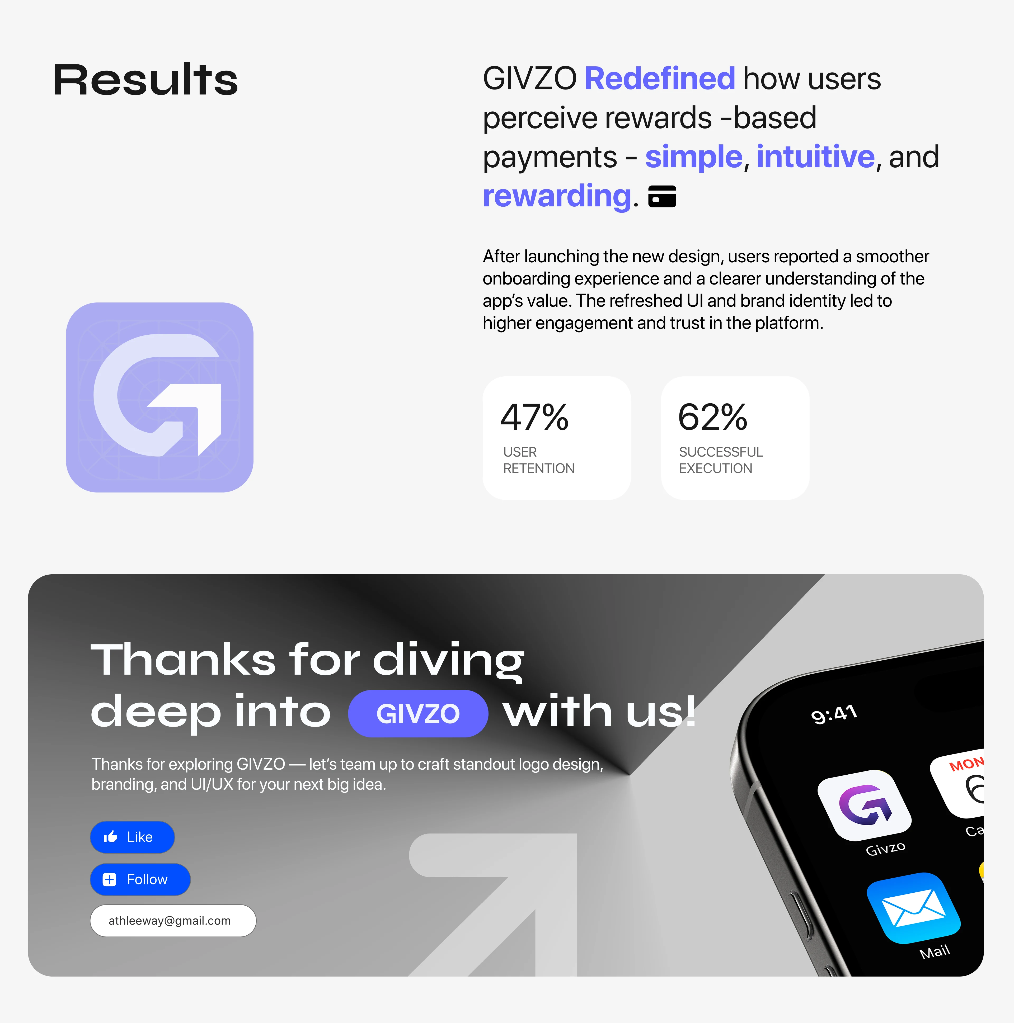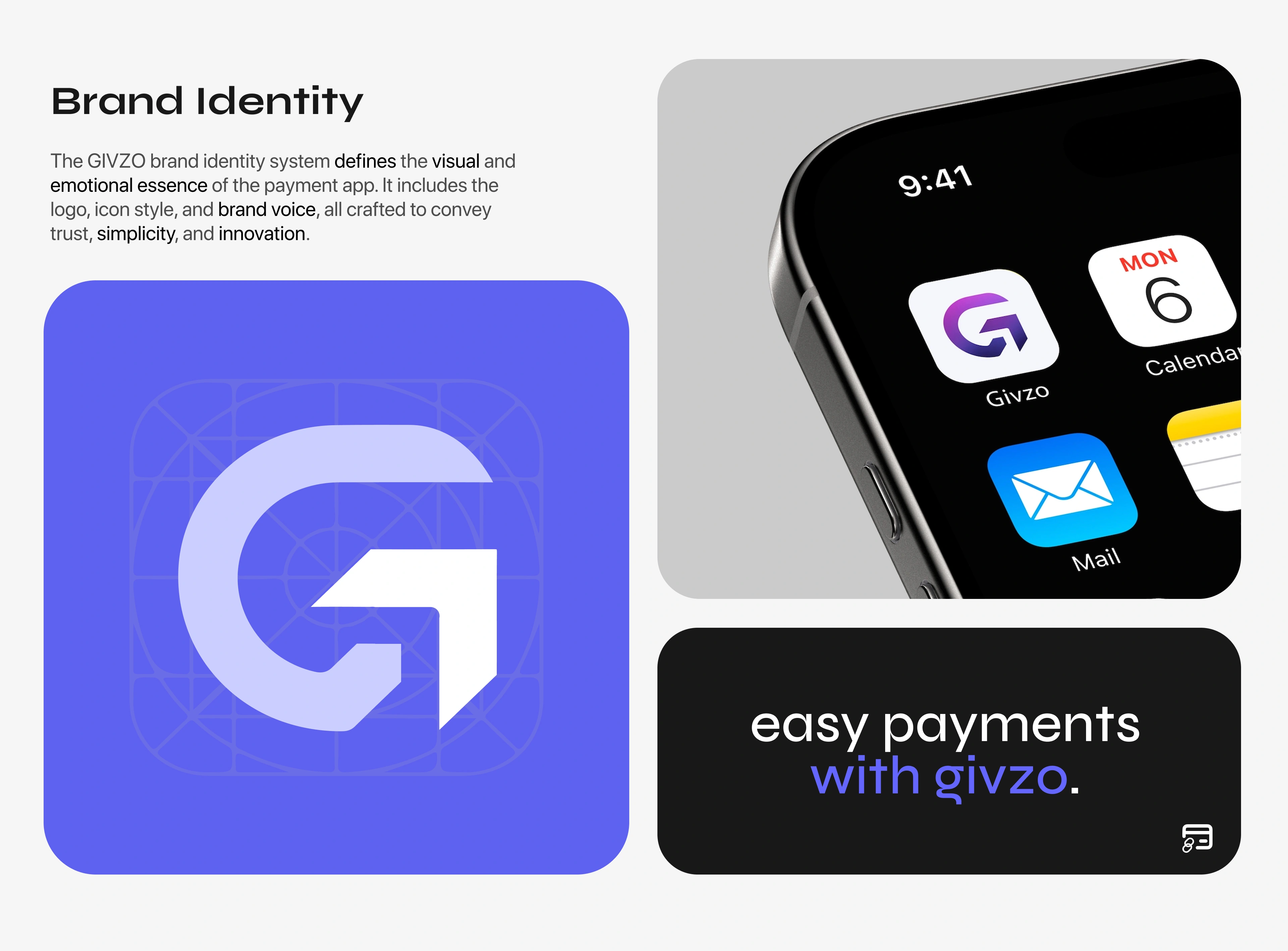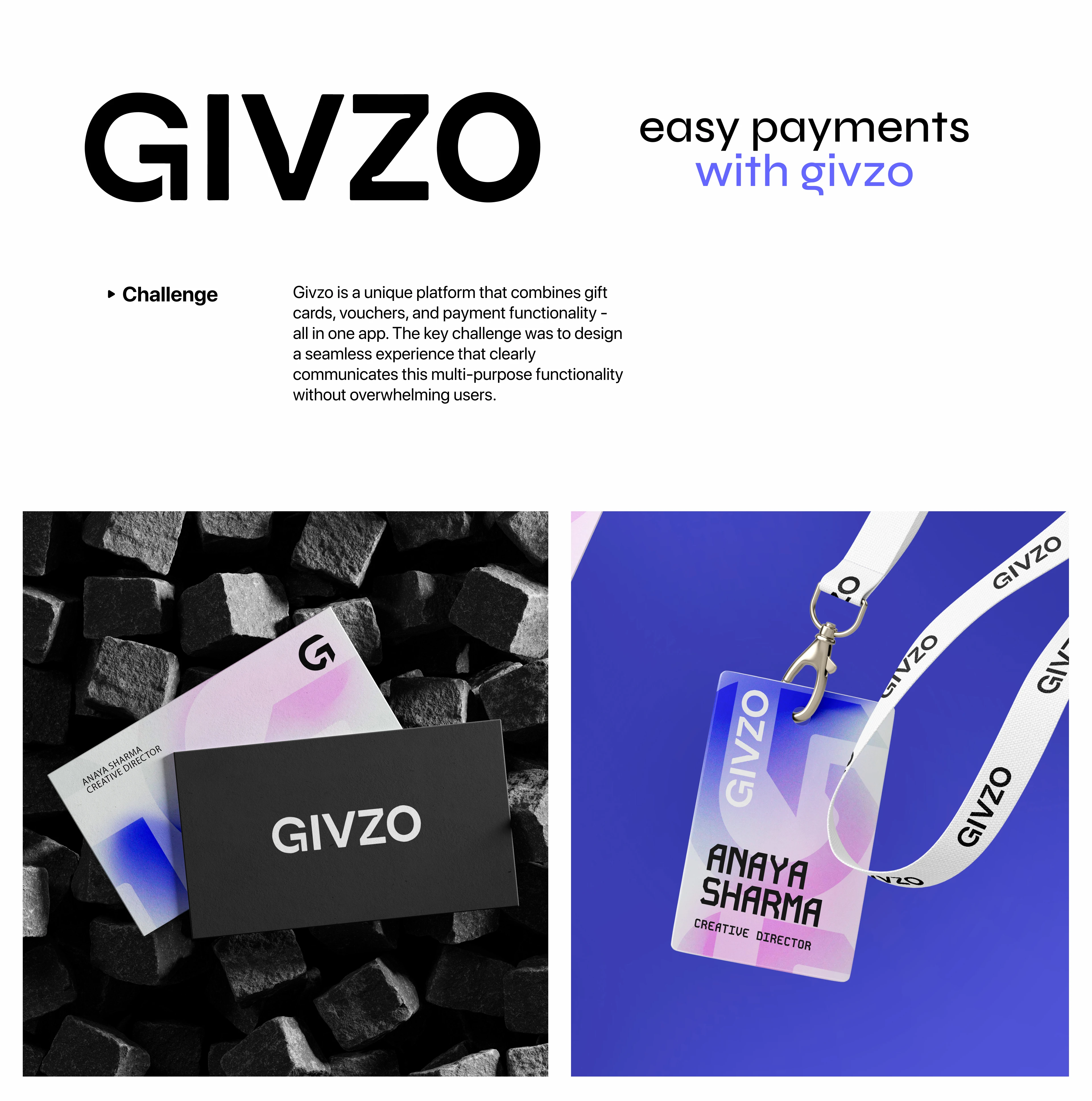 GIVZO is a modern fintech app that combines payments into one seamless experience. The complete UI/UX design, logo creation, and brand identity system.