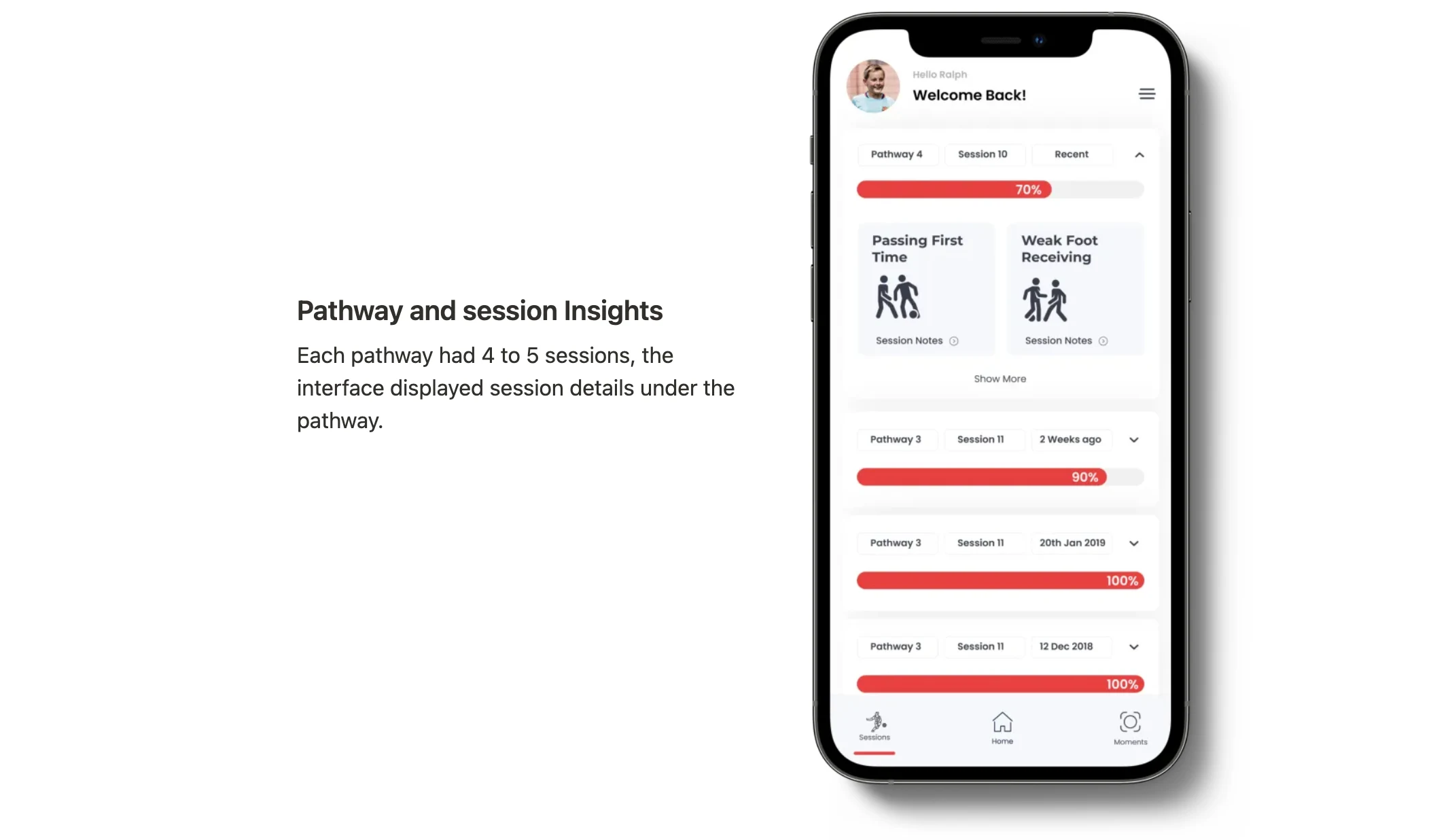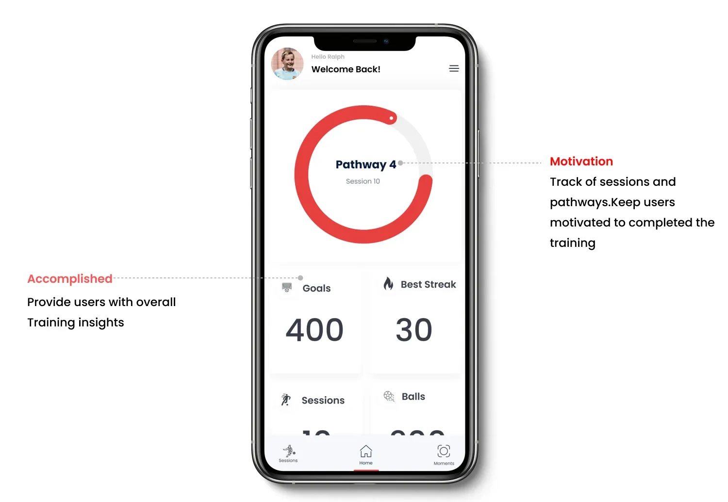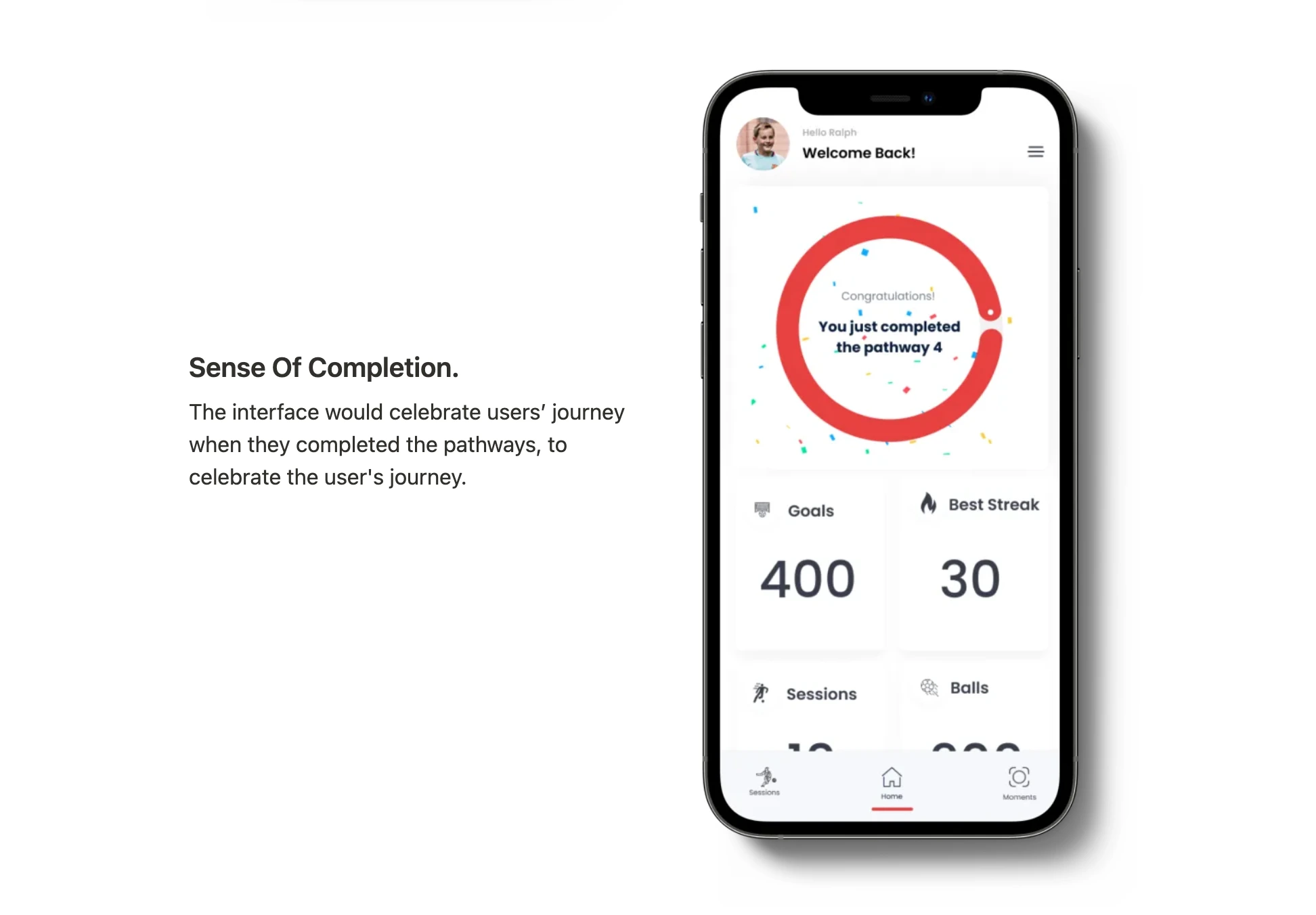 The product prototype showed users the pathway and sessions they are on. It also showed users the key training metrics like Goals, best streak, balls, and session details.