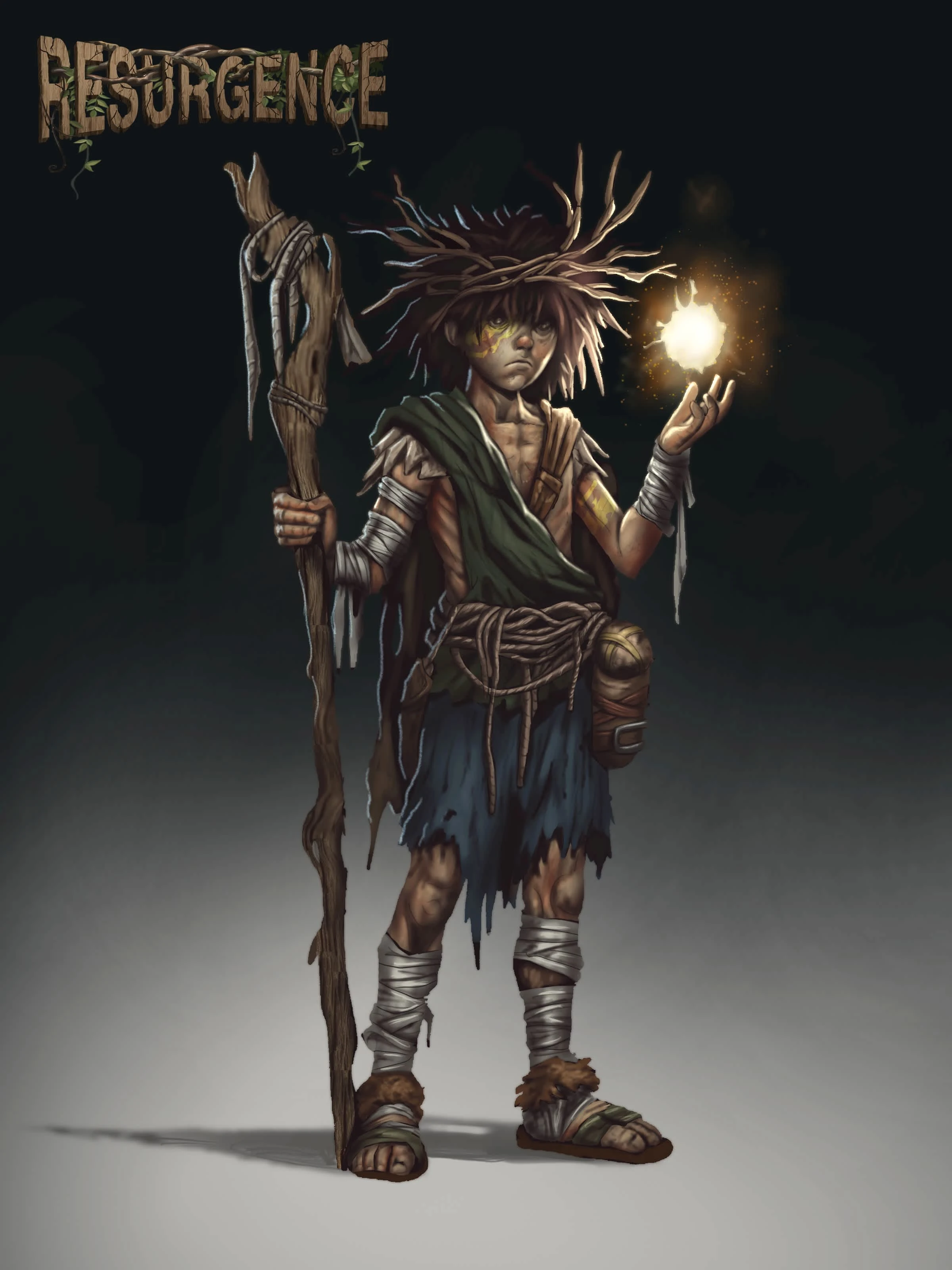 Description: A young, spirited individual with innate magical abilities, the adopted child is a symbol of hope and potential. His magical powers are a blend of the witch's teachings and his own unique talent. The child’s appearance should reflect both his human side and his mystical connection to the jungle.