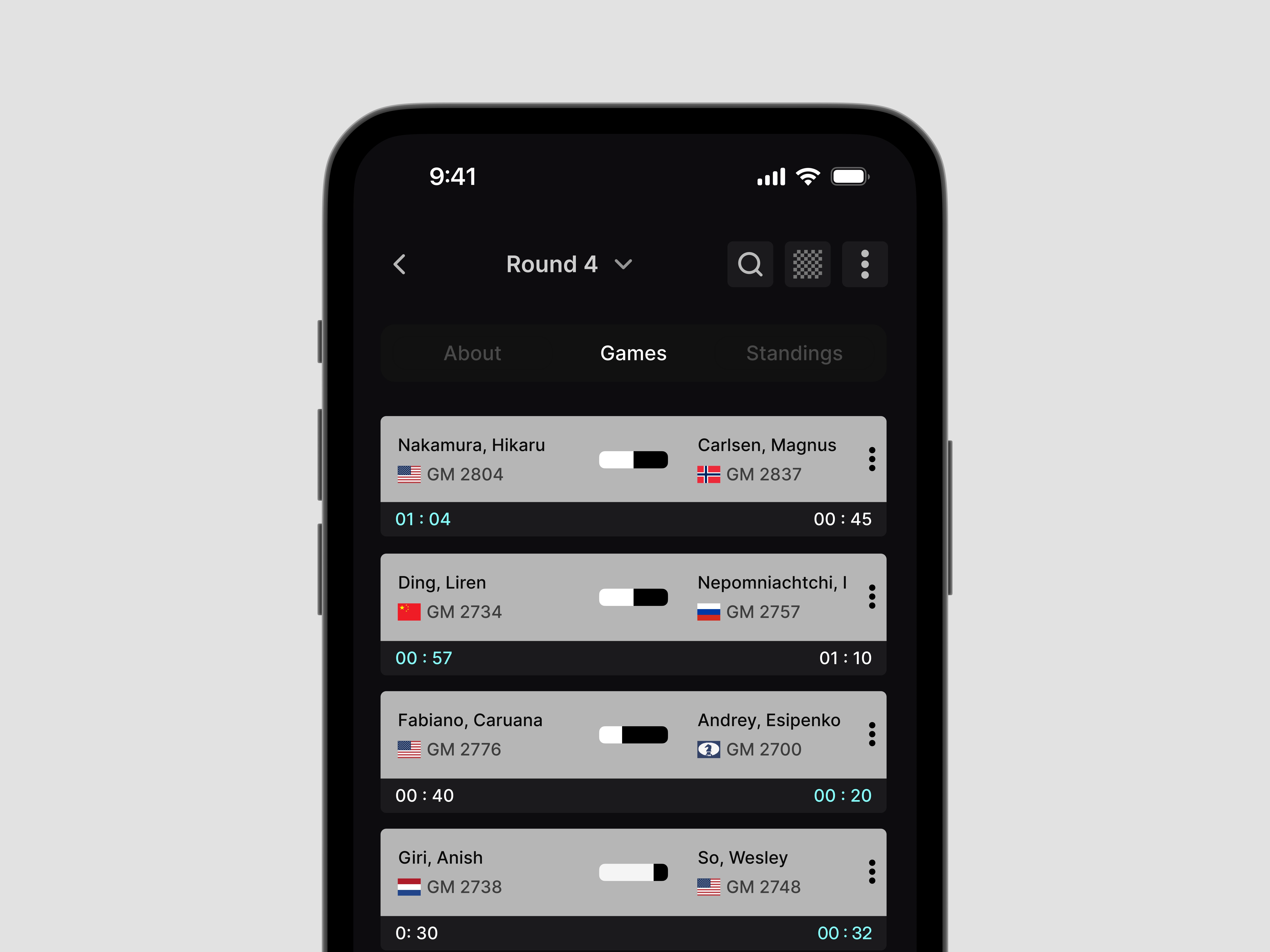 End-to-end design of Chessever — a sleek mobile app that makes following chess tournaments easier, with clean visuals and smooth interactions.