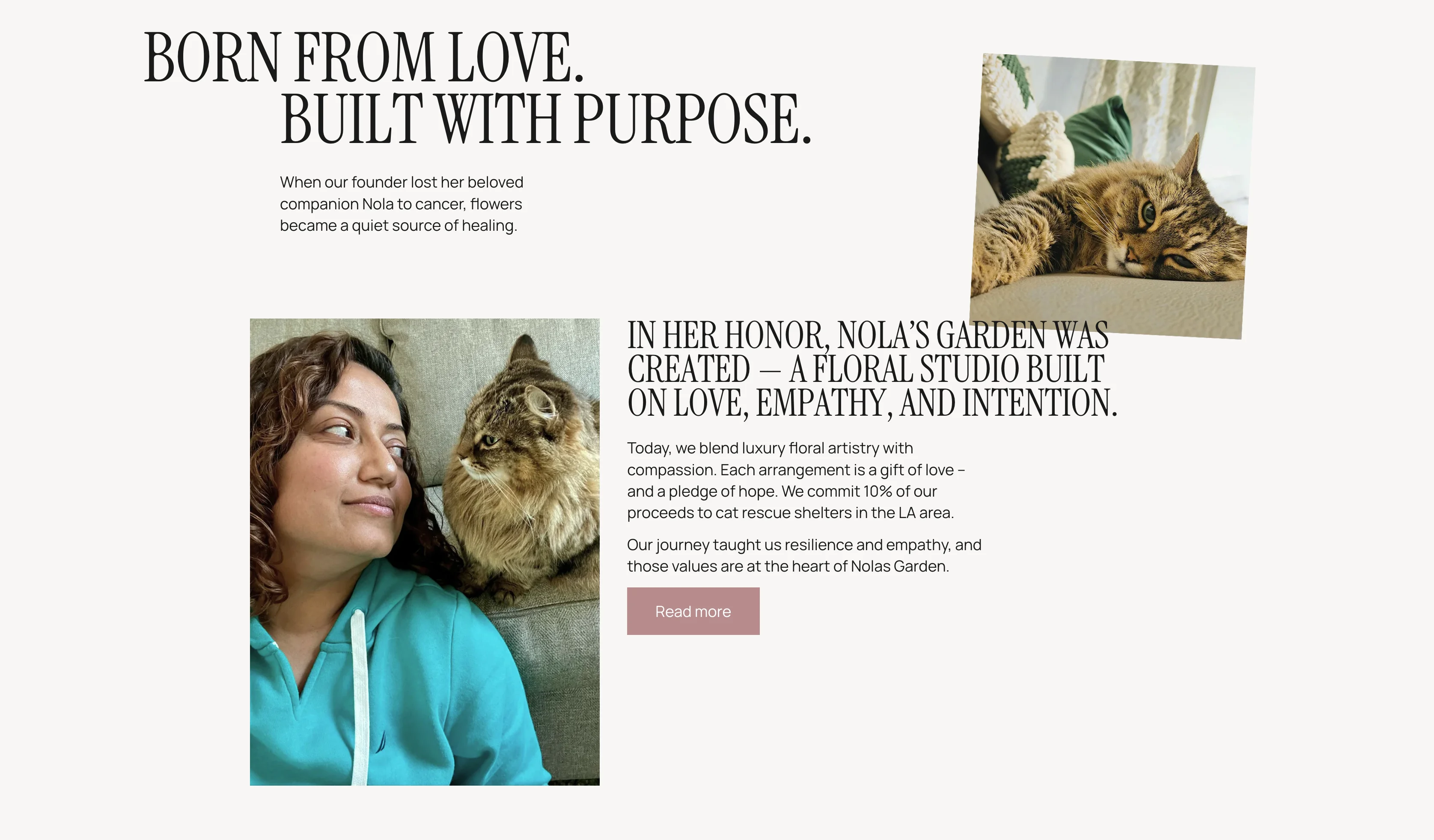 Special attention was given to storytelling on the “Our Story” section. The origin of Nola’s Garden, inspired by love, loss, and compassion, became a central emotional anchor rather than an afterthought. The design intentionally slows the user down here, letting the message land.