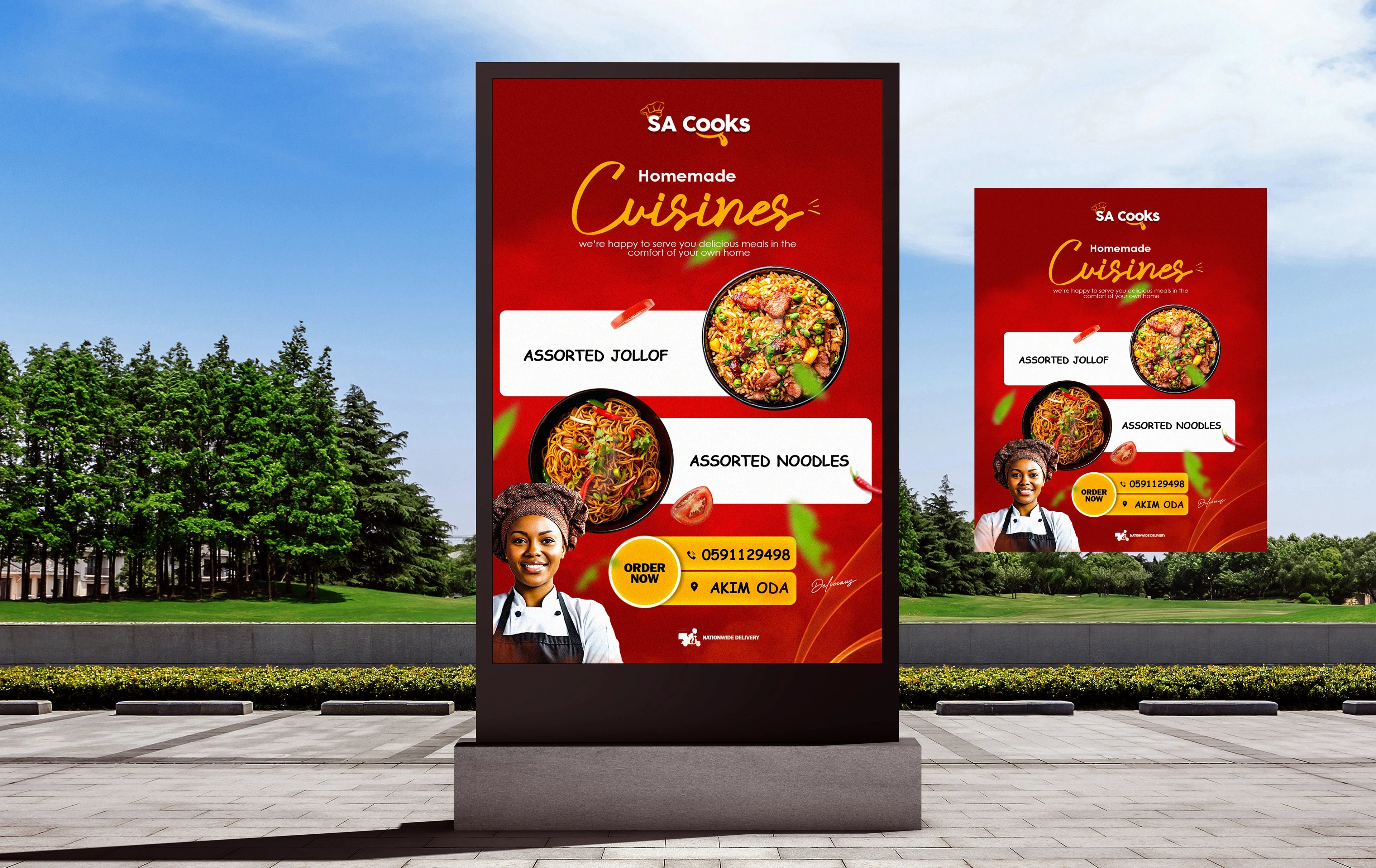 I created the brand identity for SA Cooks, including logo, mockups, and social media flyers, which boosted sales by 75% and expanded the brand’s digital reach