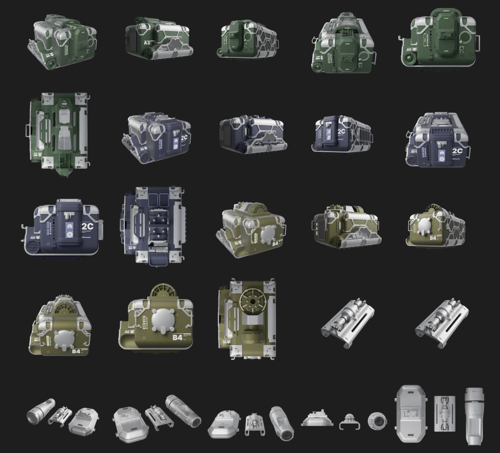 The main features we wanted to convey was sturdiness (hard metal case), complexity (glass case that shows the inside components) and electronics (there's a PCB inside). Using kitbash sets, I assembled a few product examples together.