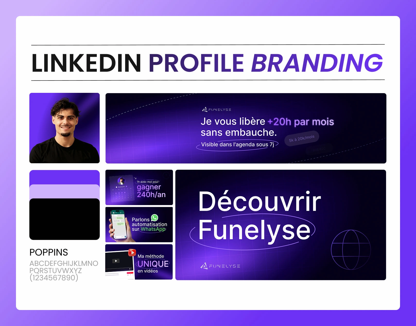 Profile Banner: His banner now communicates his core promise: “I free up +20h per month without hiring.” I used a futuristic purple palette, a subtle grid system, and a guided visual flow that makes the message impossible to miss.