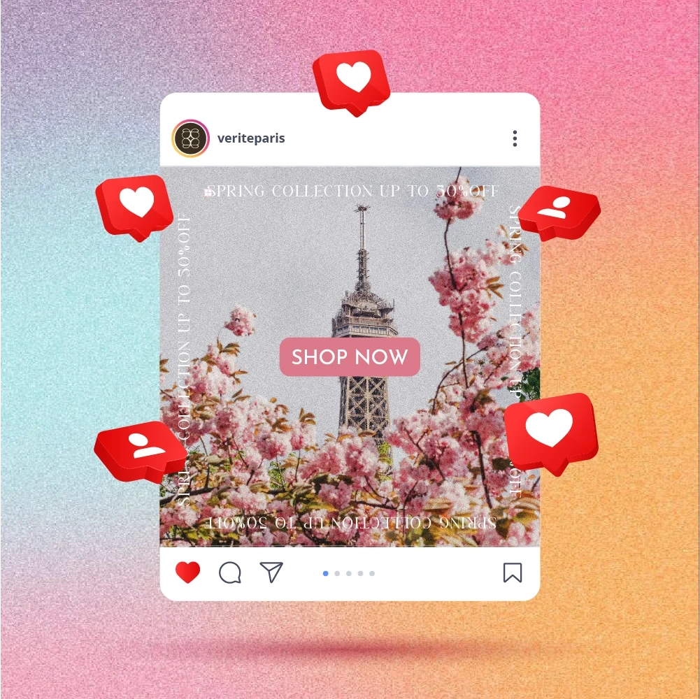I curated imagery of Vérité's pastel-toned garments, combined with iconic spring visuals of Paris (e.g. cherry blossoms, sunlit streets) to create a dreamy, romantic atmosphere. The messaging was subtle but clear — highlighting the "Up to 50% Off" in a way that felt high-end and on-brand.