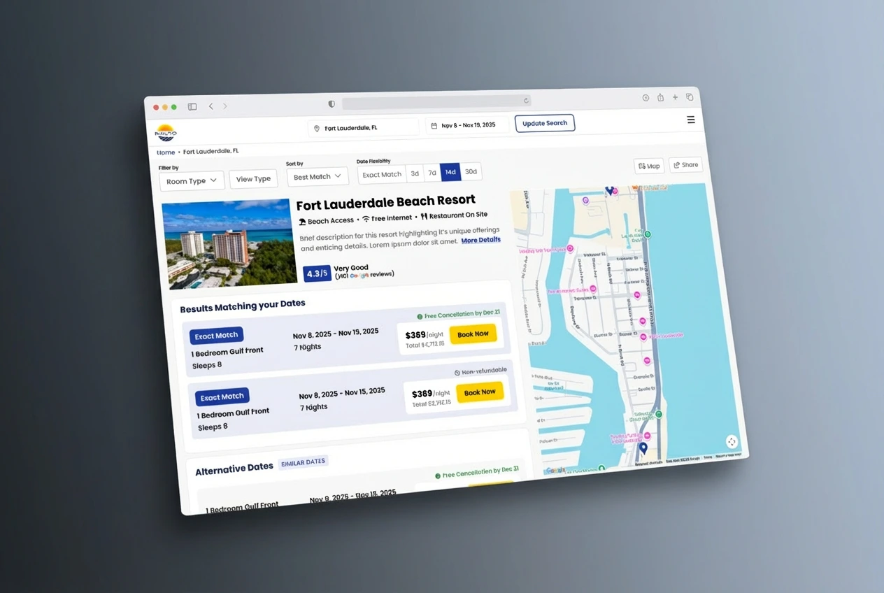 Rialto Vacations is a marketplace for timeshare resale and rental properties. They needed a modern, intuitive B2C experience that made searching, comparing, and booking resorts feel effortless. I redesigned the end-to-end user journey—from search results to resort details to checkout—focusing on clarity, visual hierarchy, trust cues, and ease of decision-making.