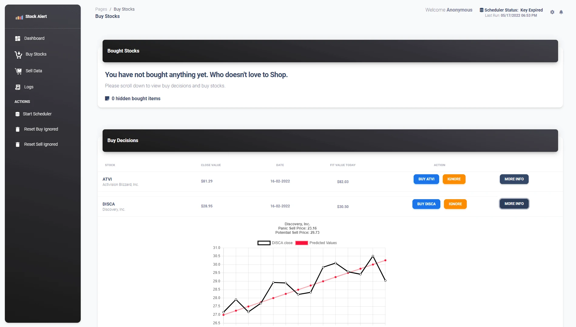 StockAlert was built to get realtime stock information from yahoo finances and then decide which stocks to buy/sell based on calculated parameters and stock trajectory to maximize profits and minimize loss.