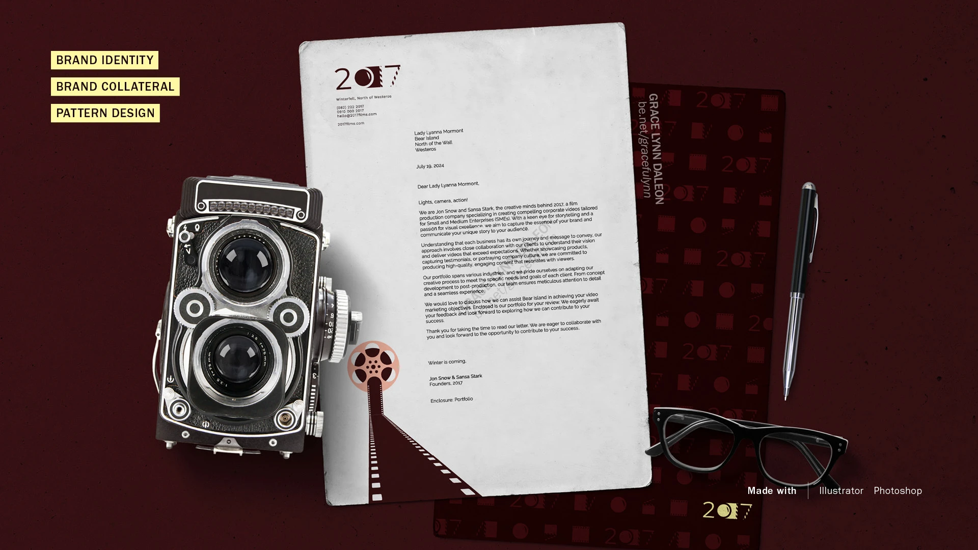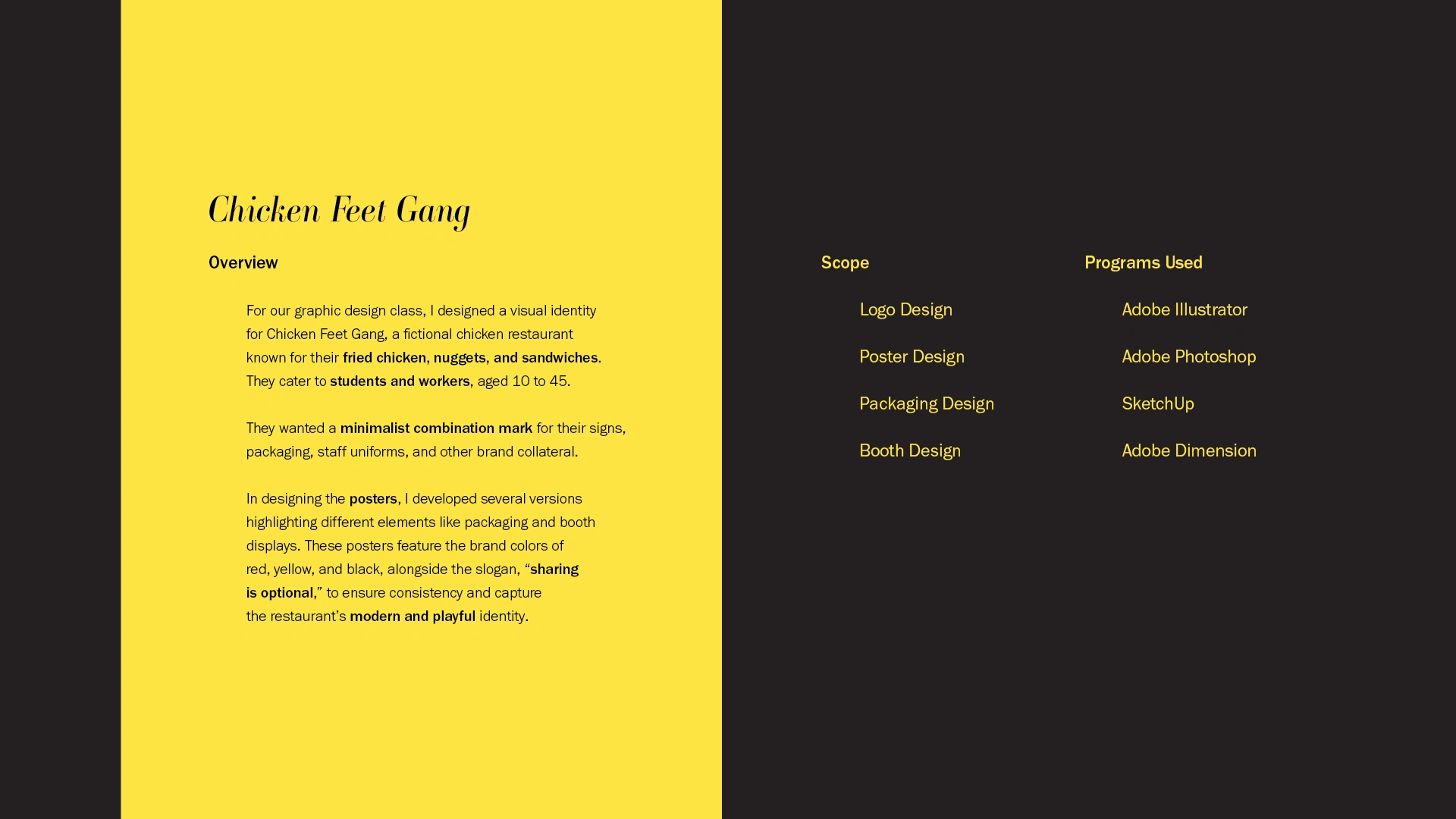 This portfolio presents a diverse selection of my graphic design projects, including brand identity, print design, UI/UX design, and booth design, among others.