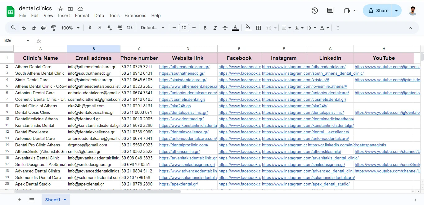 Generated a verified list of dental clinics with decison makers names, emails, and Linkedin profiles to support targeted outreach and marketing campaigns.