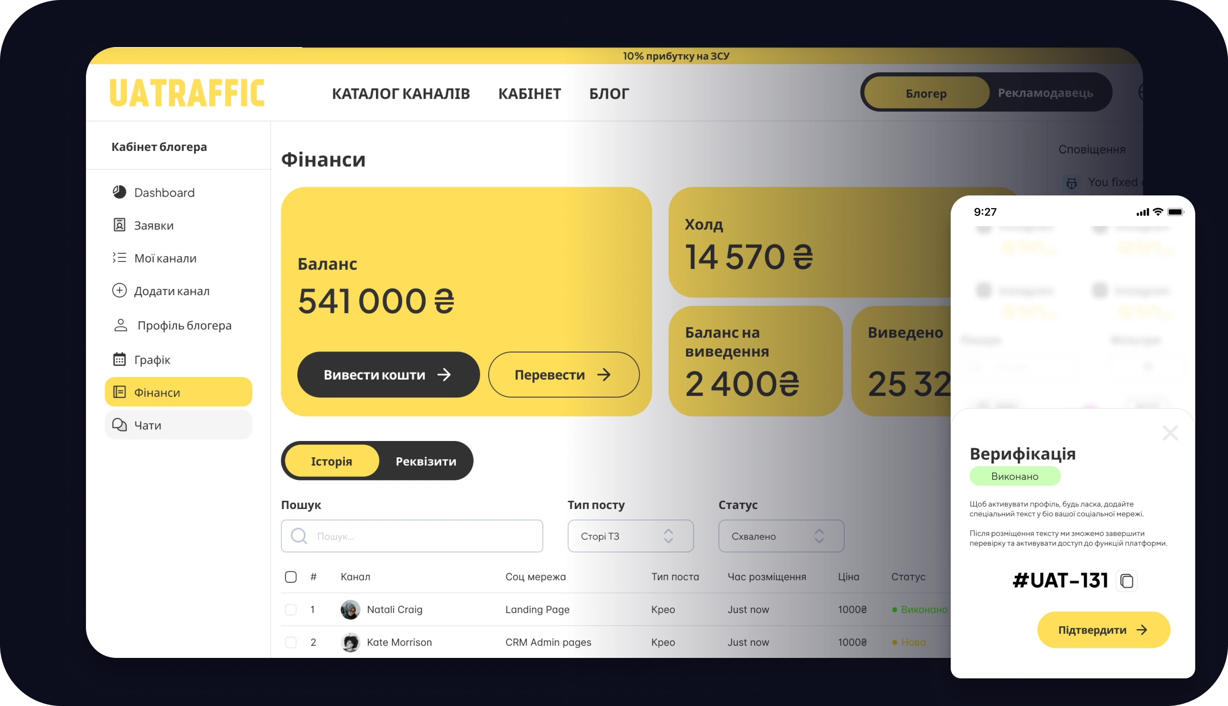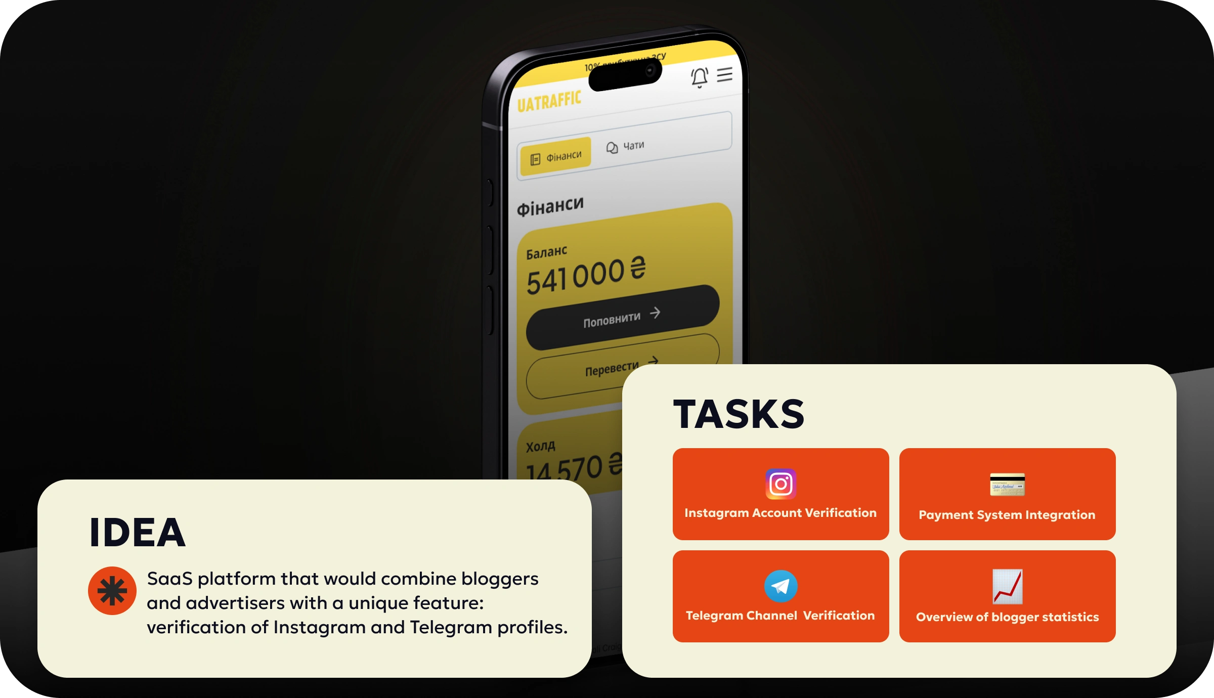 The client contacted me through another freelance platform and expressed a desire to create a full-fledged SaaS platform that would combine bloggers and advertisers with a unique feature: verification of Instagram and Telegram profiles. He also wanted me to help him finalize the terms of reference with my expertise π