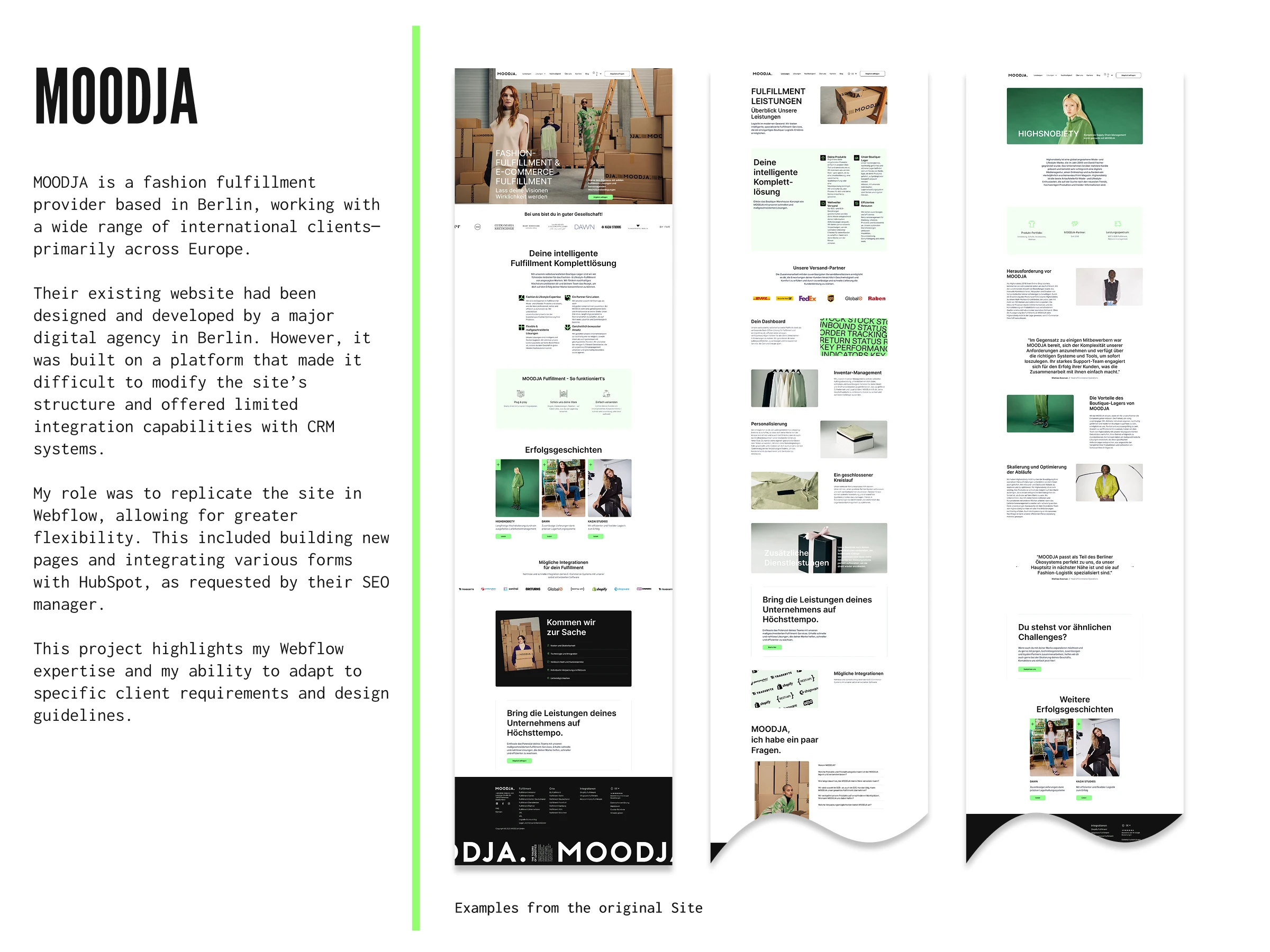 Replicated MOODJA’s site in Webflow, enabling CRM integration and future updates while following their design and SEO requirements.