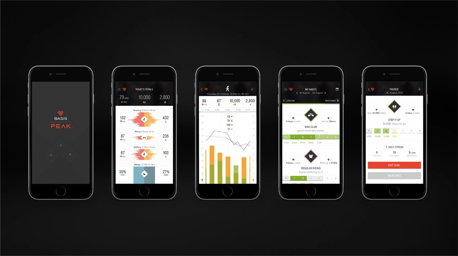 Led UX/UI redesign for Basis Peak's iOS & Android apps at Pivotal Labs. Delivered interactive health, sleep, and habit tracking features in just 5 months.