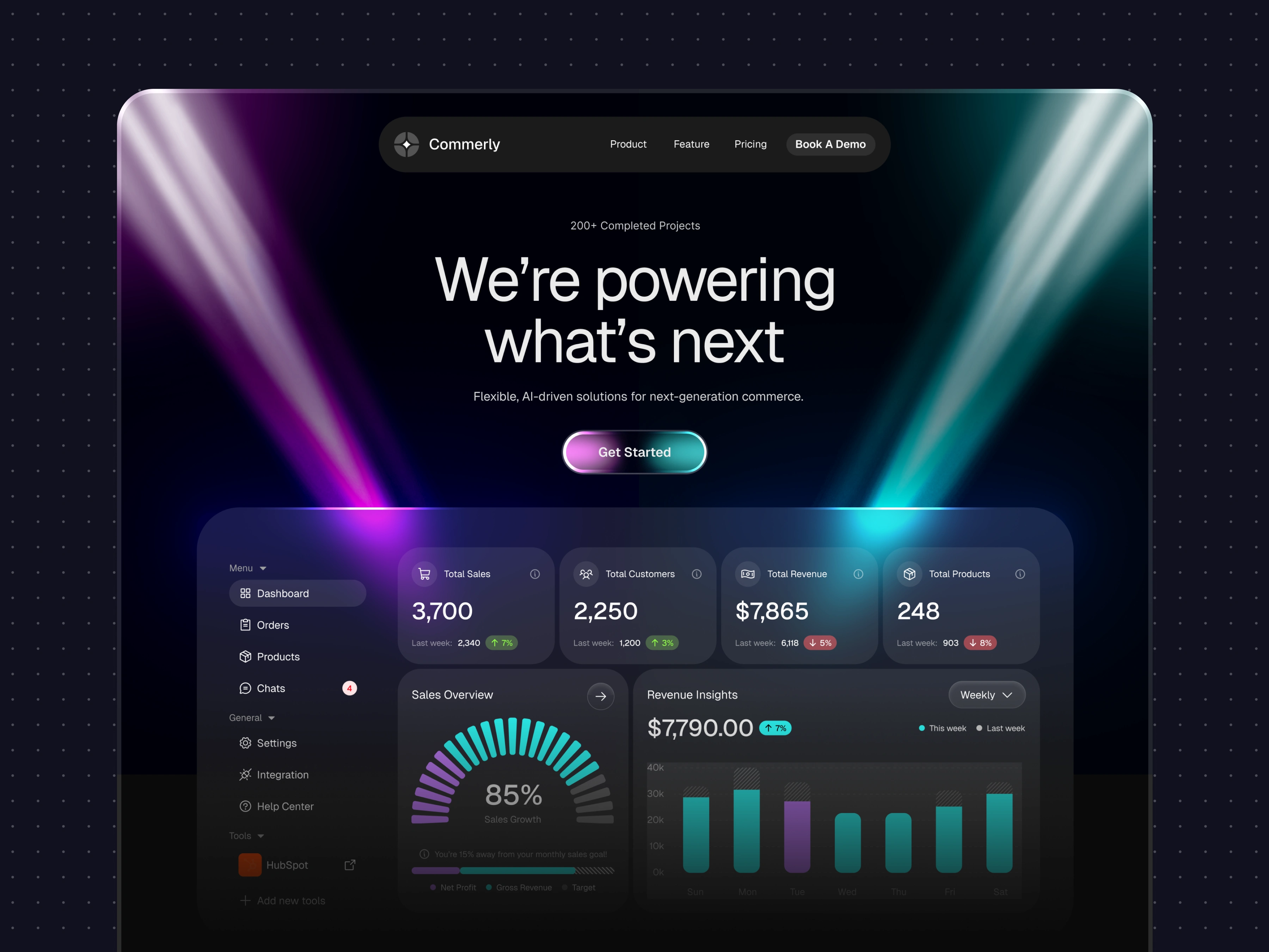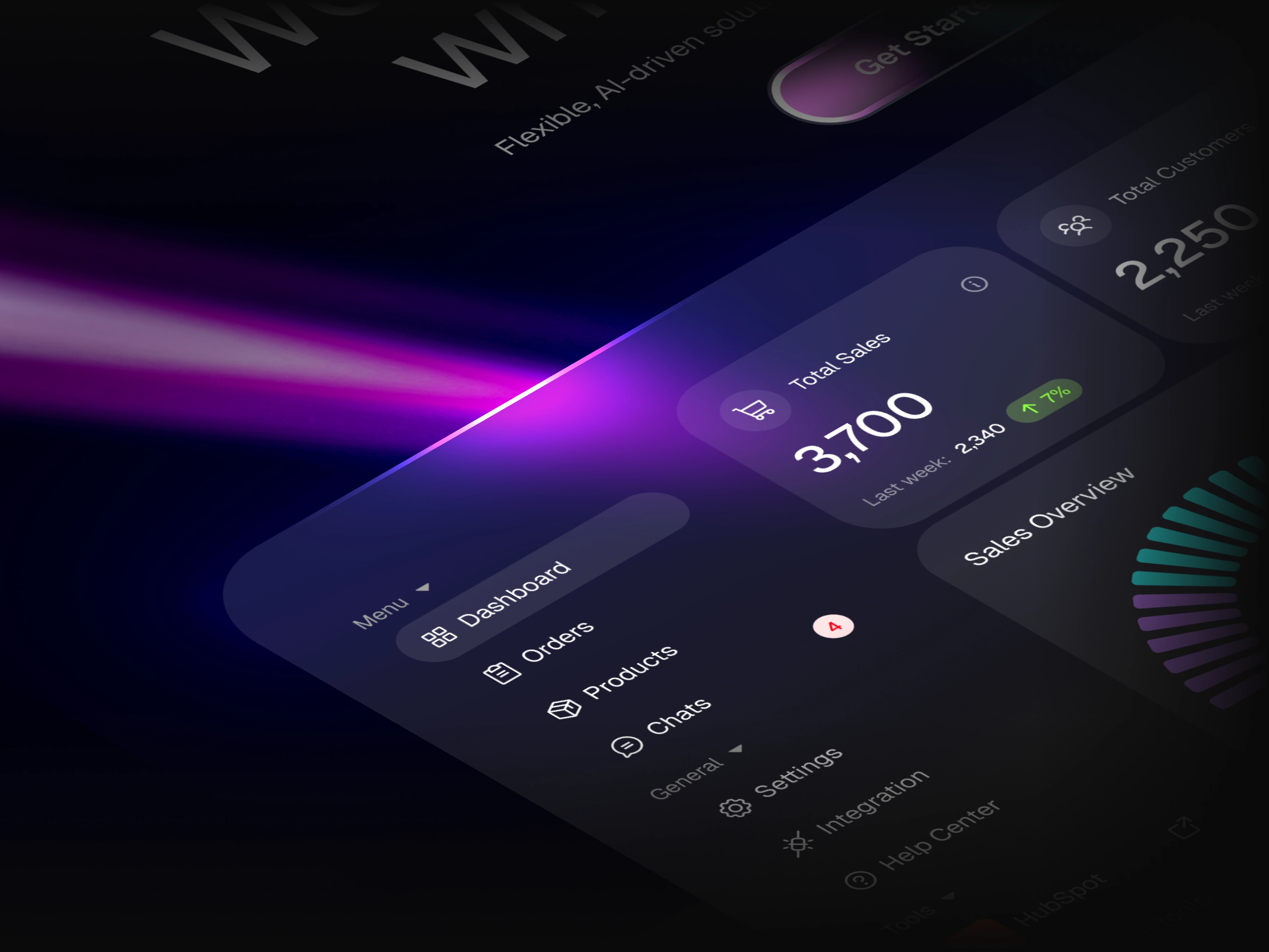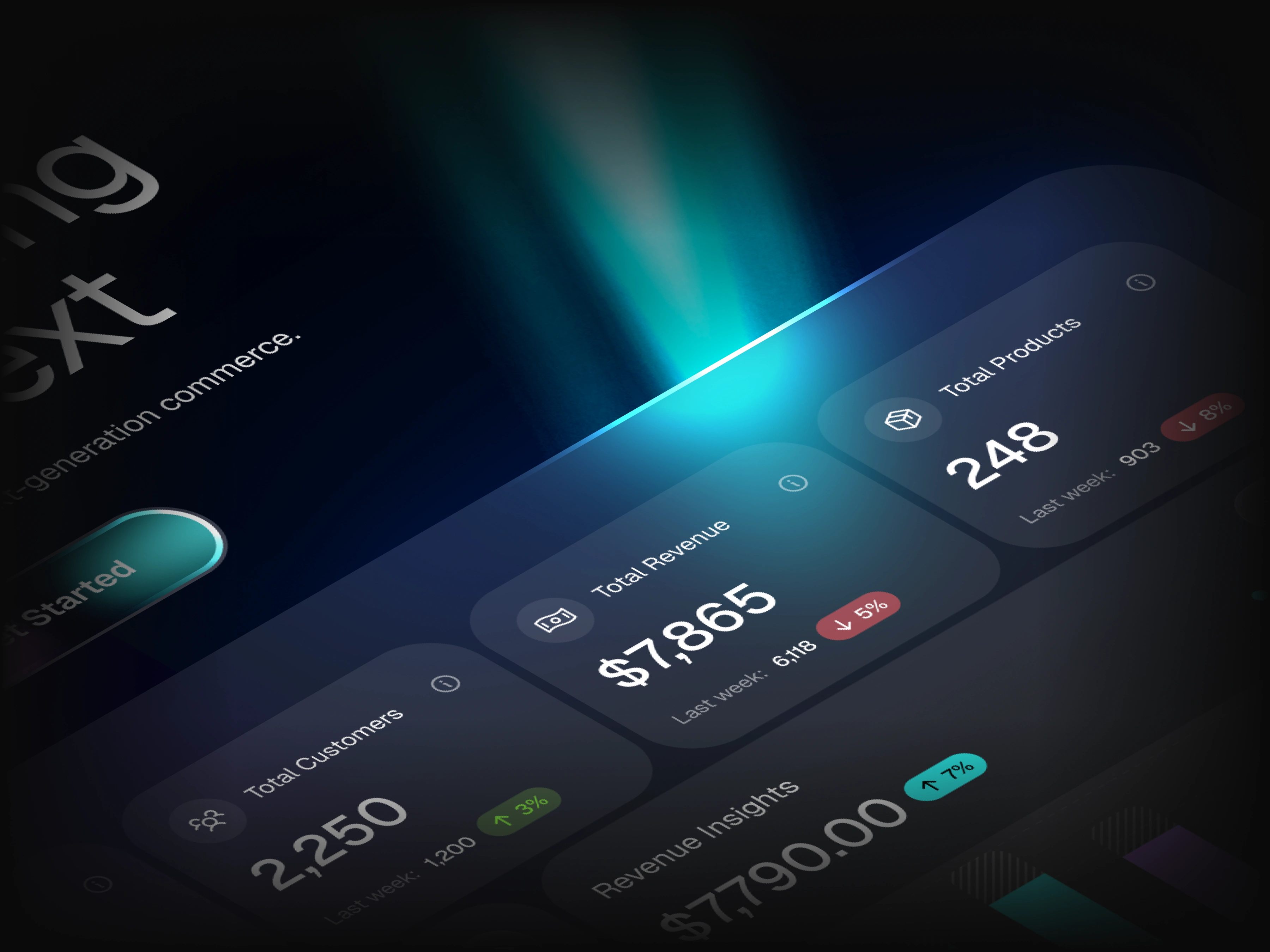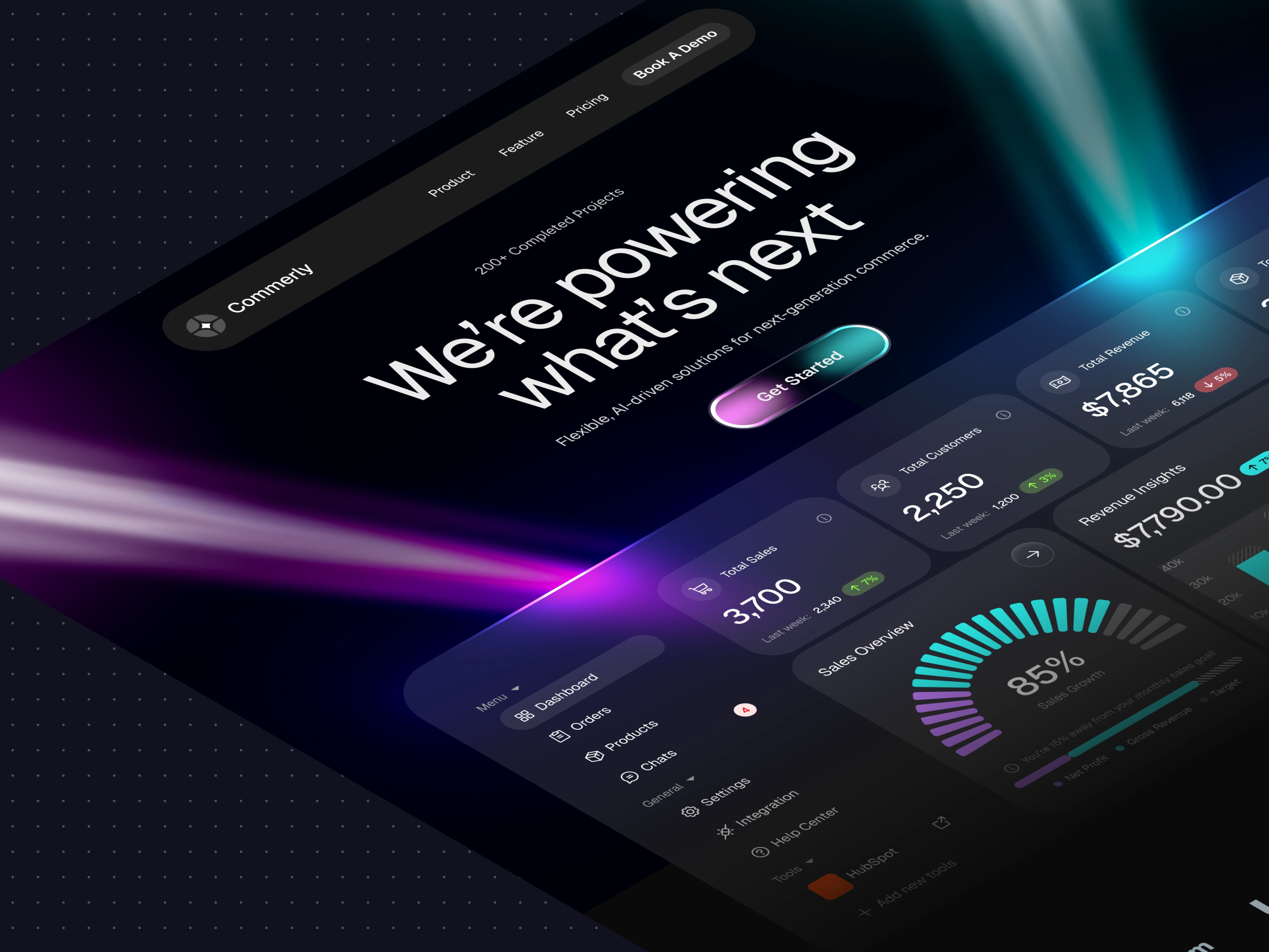 A futuristic SaaS landing page with cinematic lighting and dynamic light beams flowing into the dashboard, creating depth, energy, and a premium visual impact.