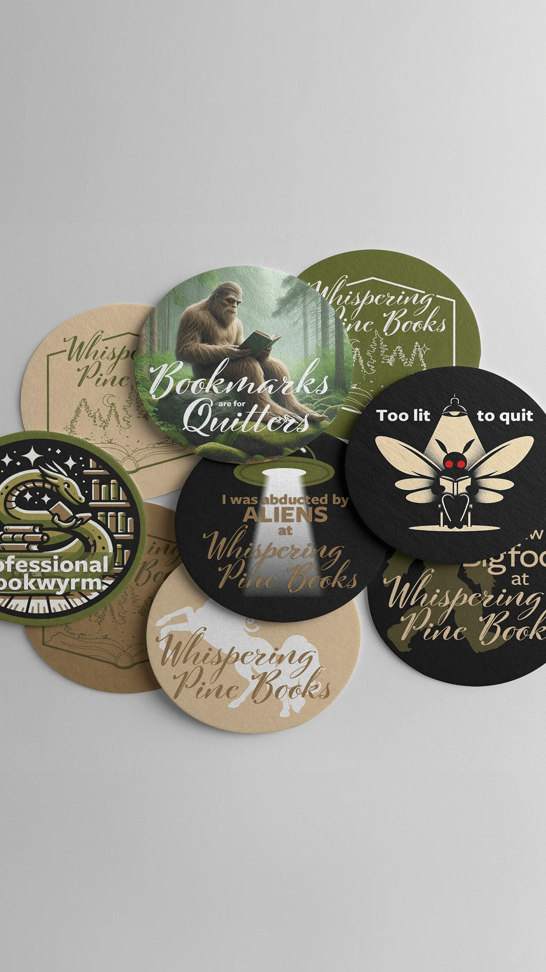 Branding Design for a cryptid-inspired bookstore, including product mockups.