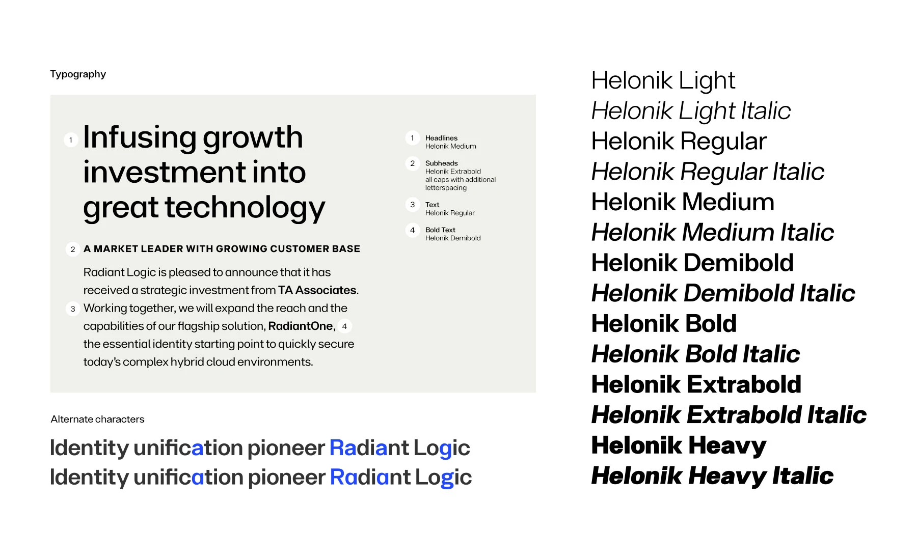 True story redesigned the brand identity for Radiant Logic. The new logo illuminates a pyramid, the symbol for a directory in computing visualization.