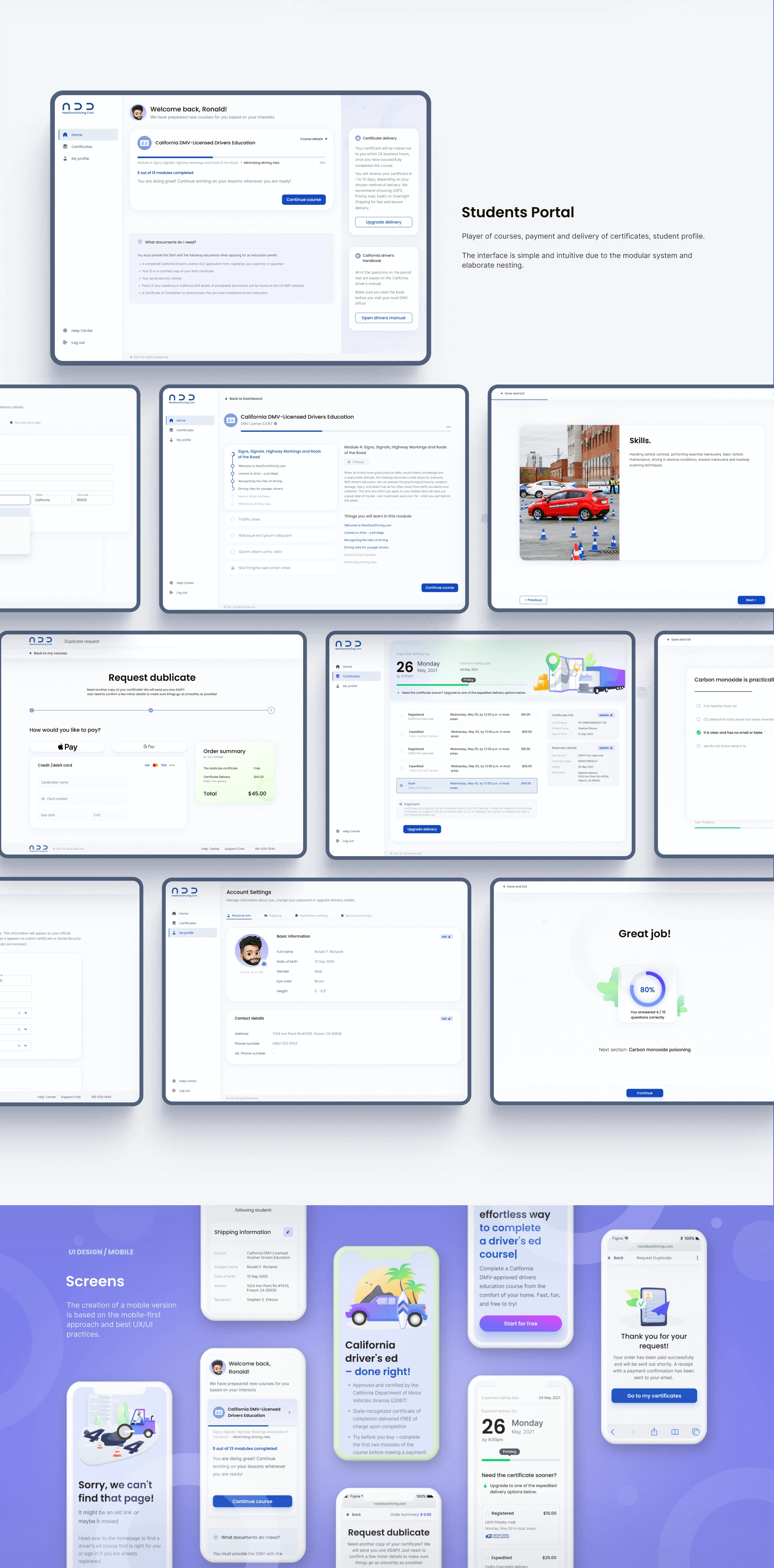 I created a driver's ed platform for all devices, replacing outdated classes. With 24/7 access, intuitive UI, and full support, it meets modern learners' needs.