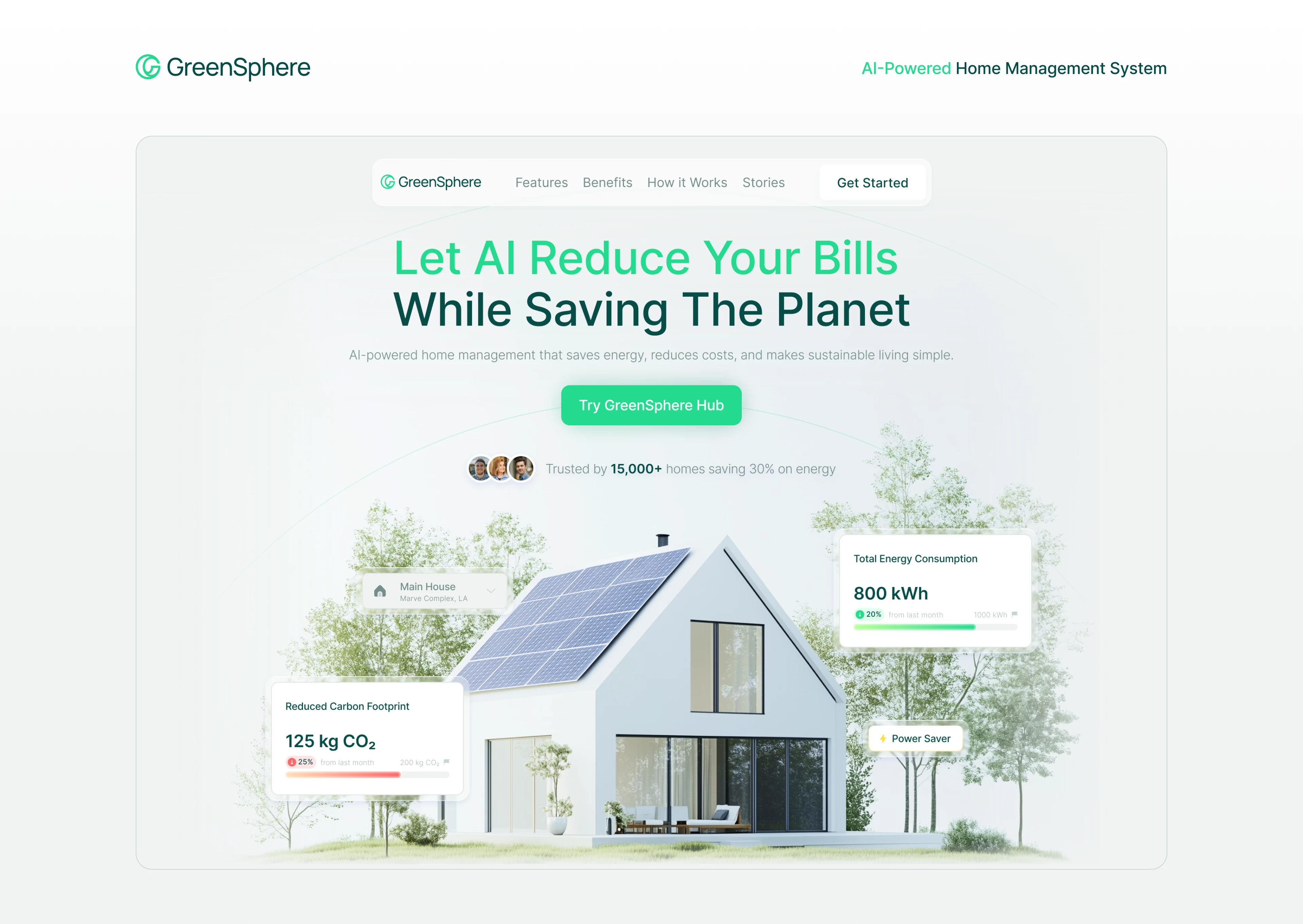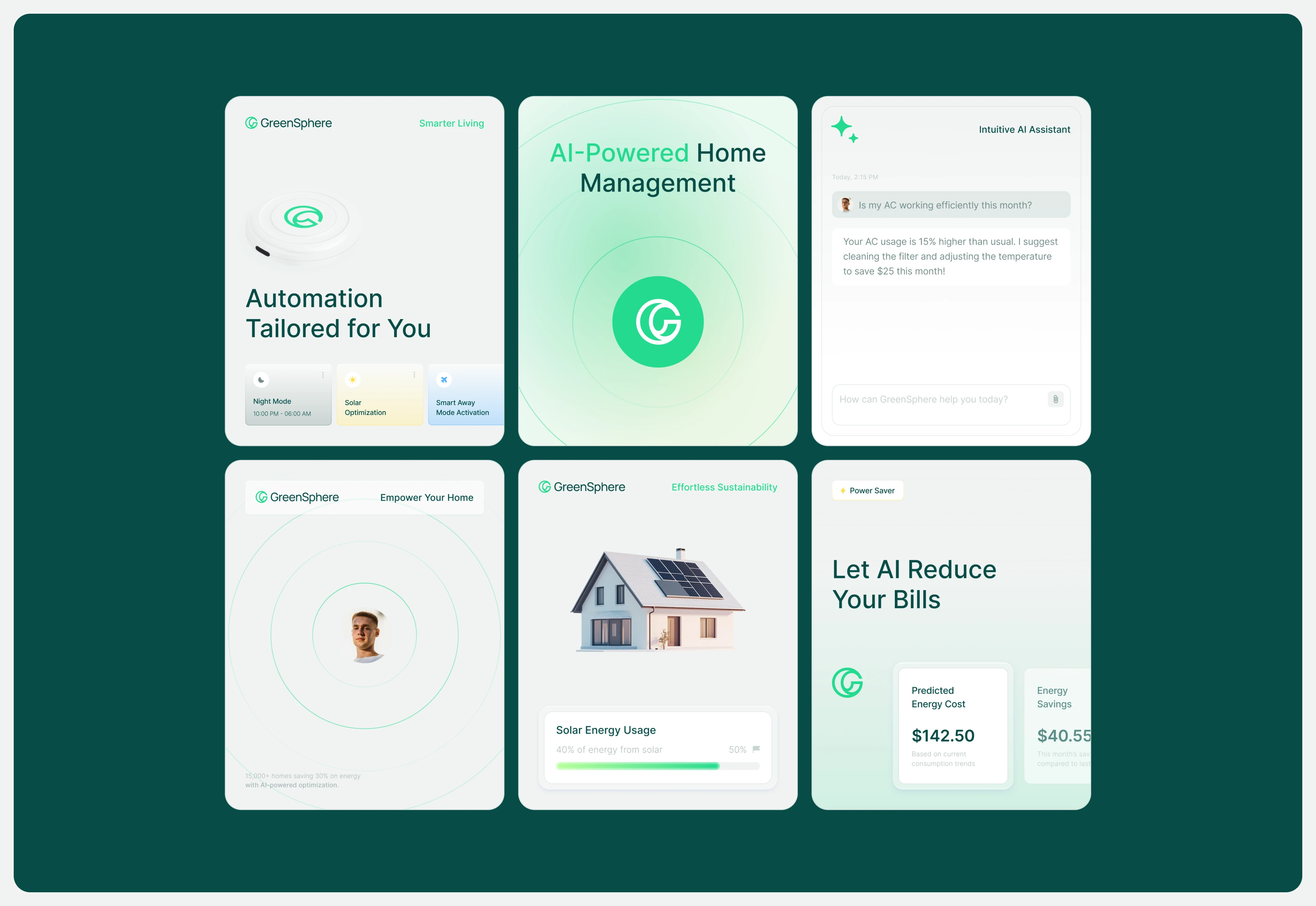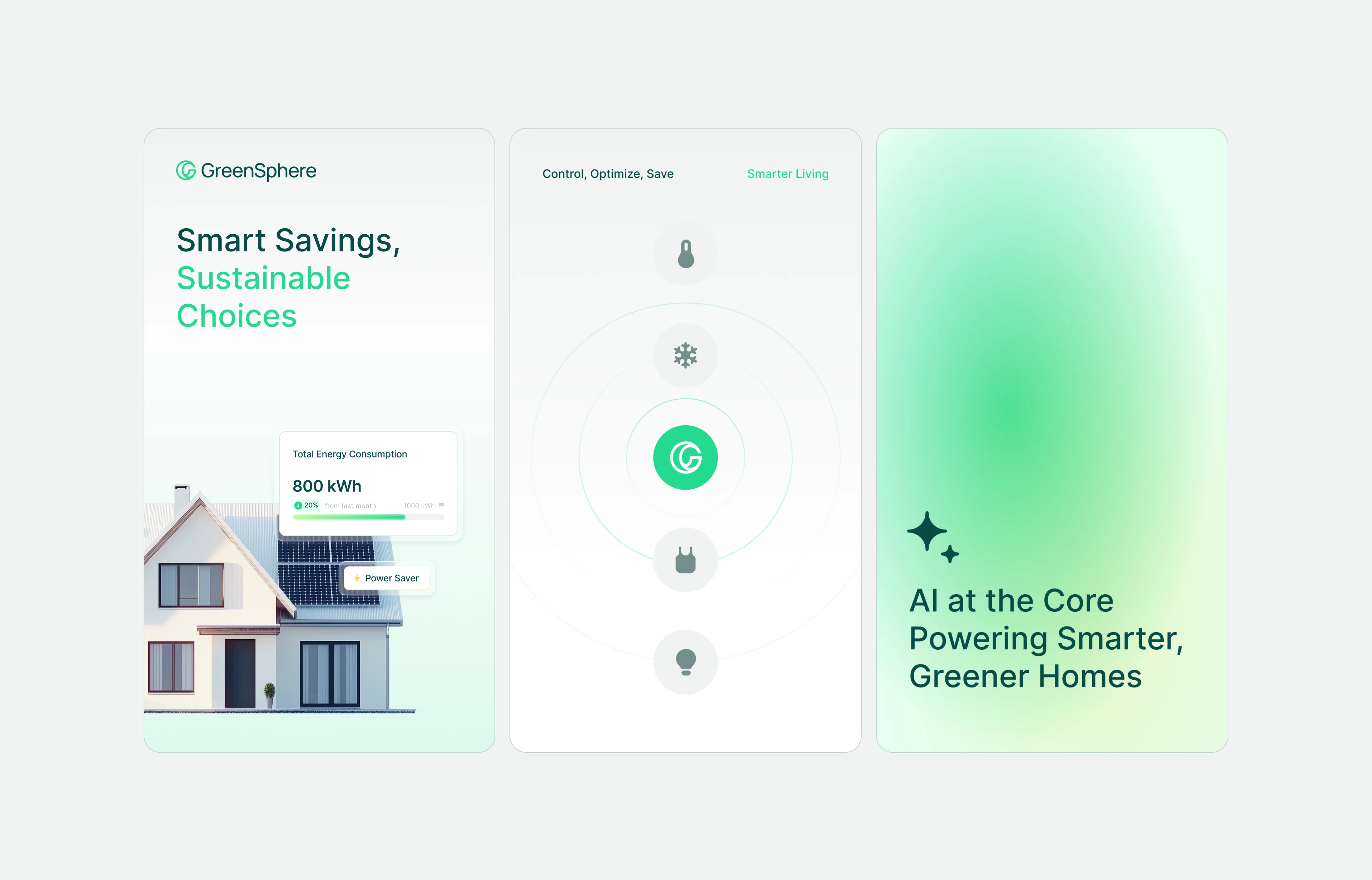 A complete brand identity and digital experience for GreenSphere, an AI-powered smart home system focused on sustainability.