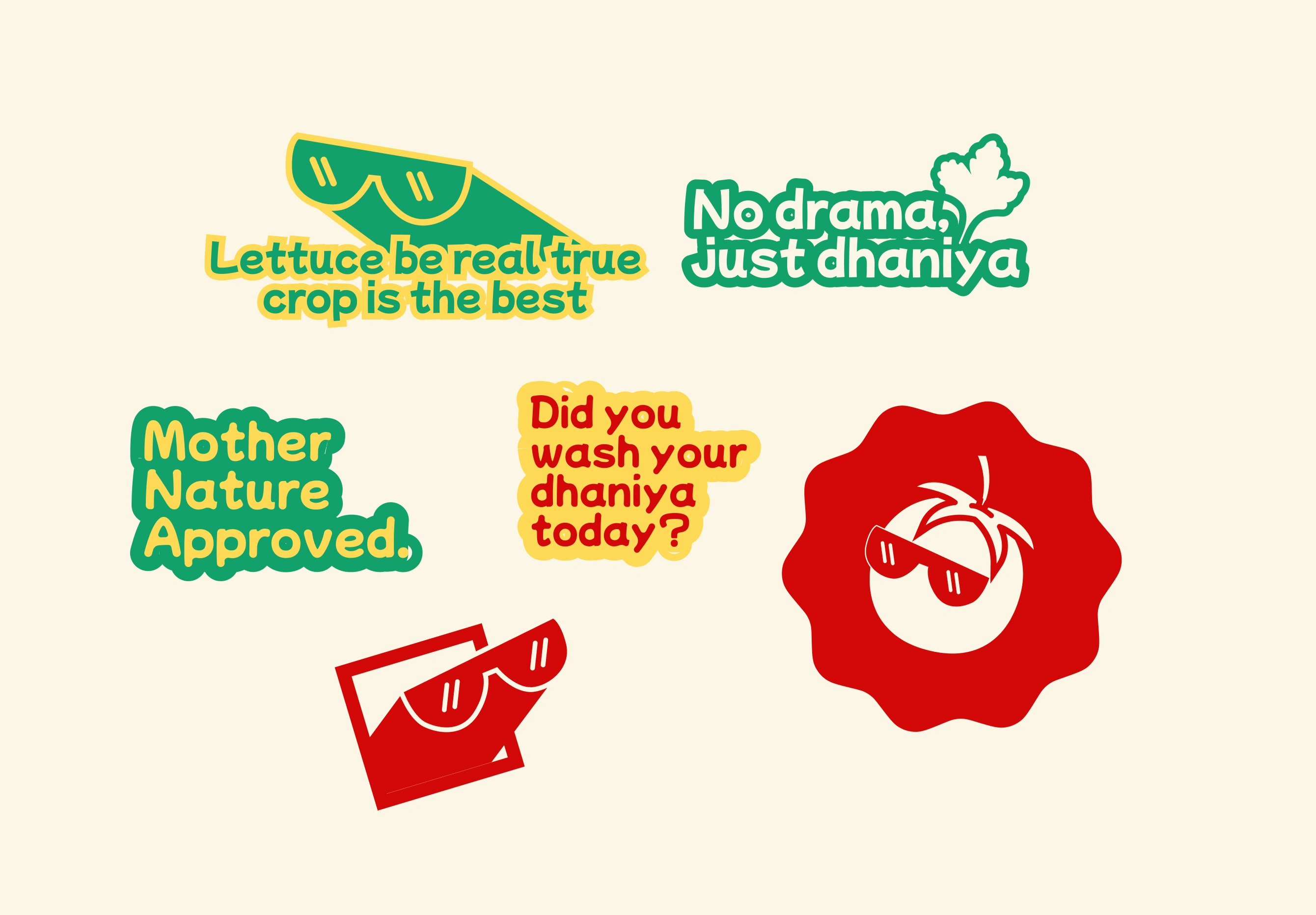 The set includes a mix of quirky veggie puns, mascot illustrations, and playful reminders that bring the brand’s personality to life