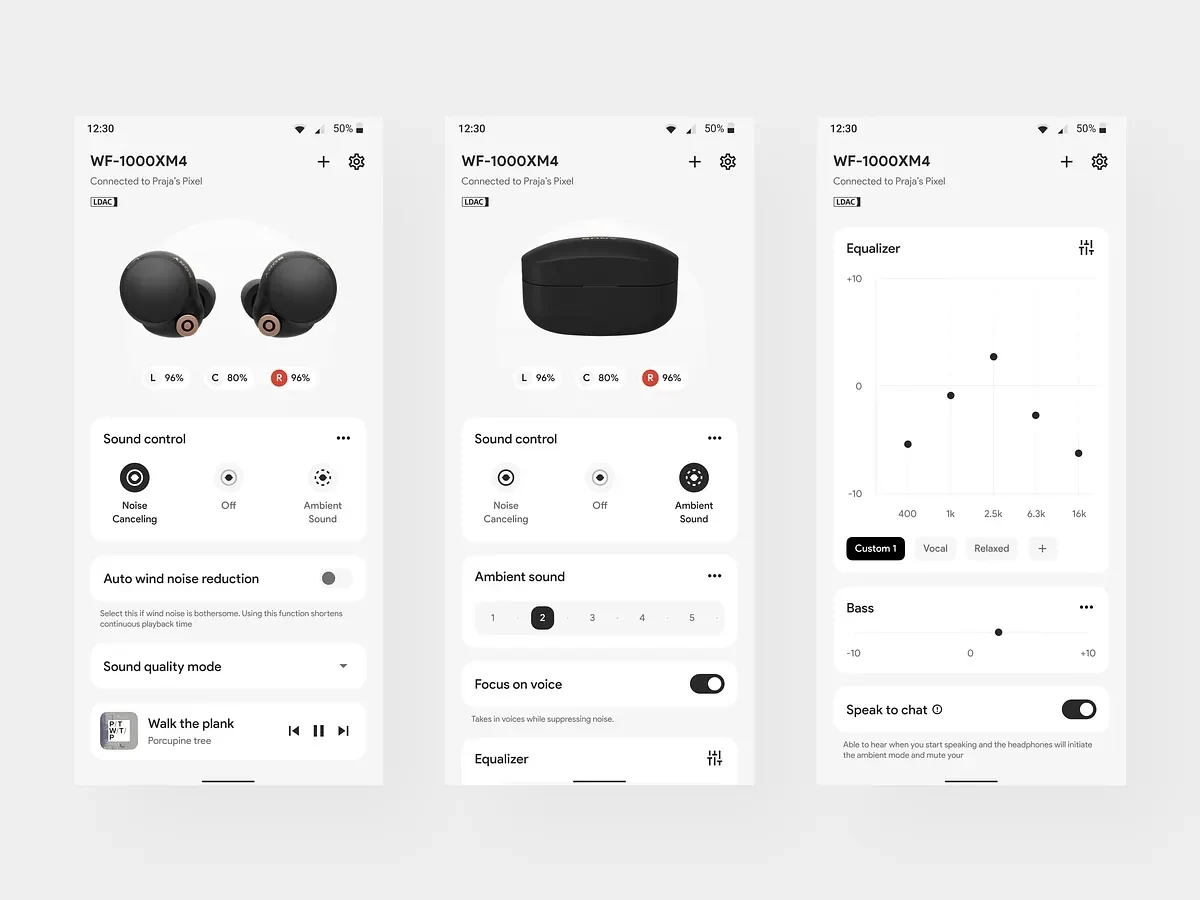 Mobile UI/UX for a TWS headphone controller. Easily customize EQ, manage noise cancellation, check battery life, and update firmware from one focused app.