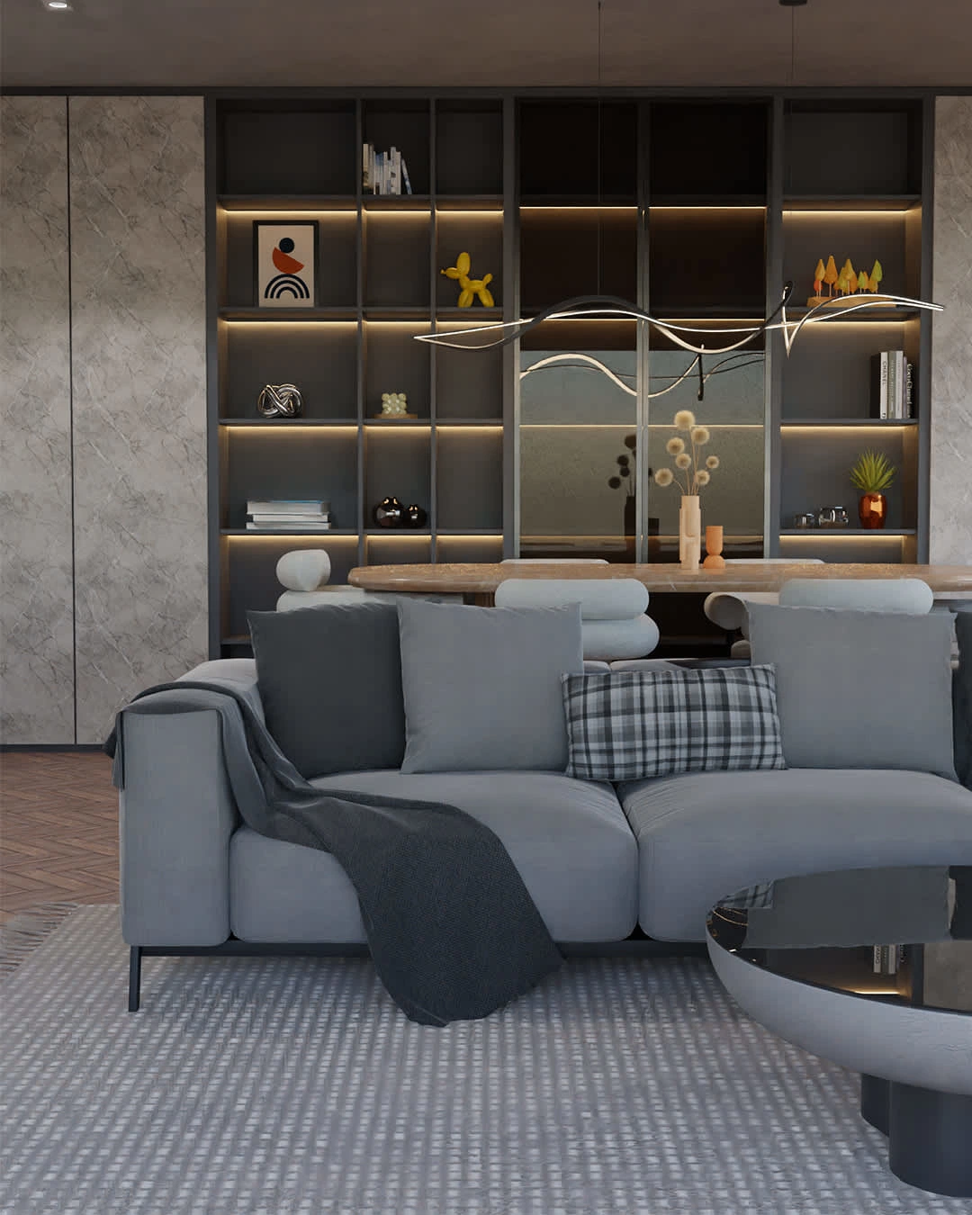 This elegant living room design features a sophisticated grey color palette, creating a serene and modern atmosphere