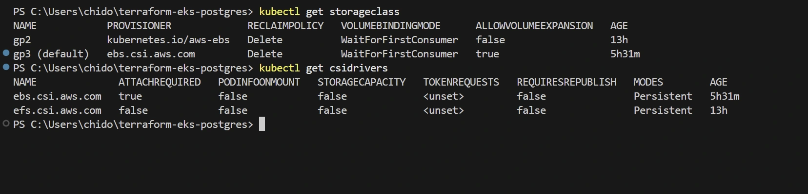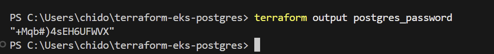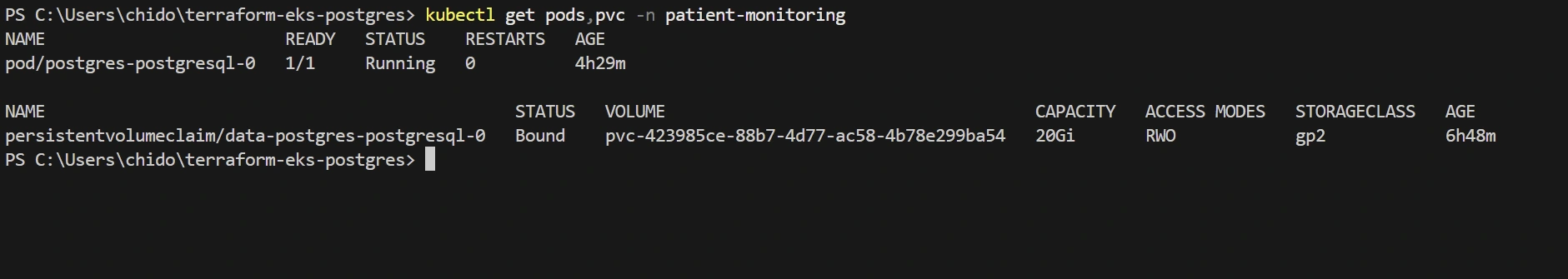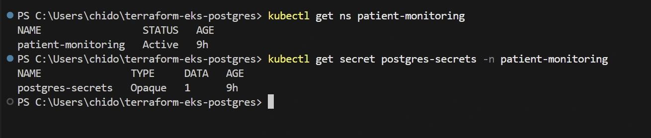 gp3 StorageClass for automatically provisioning storage when neededpatient-monitoring namespace for logical isolationpostgres-secrets Secret for secure credential storageabc.git remote add origin <URL> tells Git where to send your code online.git push -u origin master uploads your code and remembers the branch for future pushes..tf files, README.md, and your screenshots/ directory.terraform init prepares your directory for Terraform operations.terraform plan shows a preview of changes before applying them.terraform apply creates the actual resources in AWS.yes.kubectl how to talk to your new EKS cluster:update-kubeconfig writes cluster credentials to your local configuration.kubectl get nodes command should show your EKS nodes in Ready state.random_password Terraform resource ensures strong, unique passwords.patient-monitoring) creates a boundary around database resources.main branch.