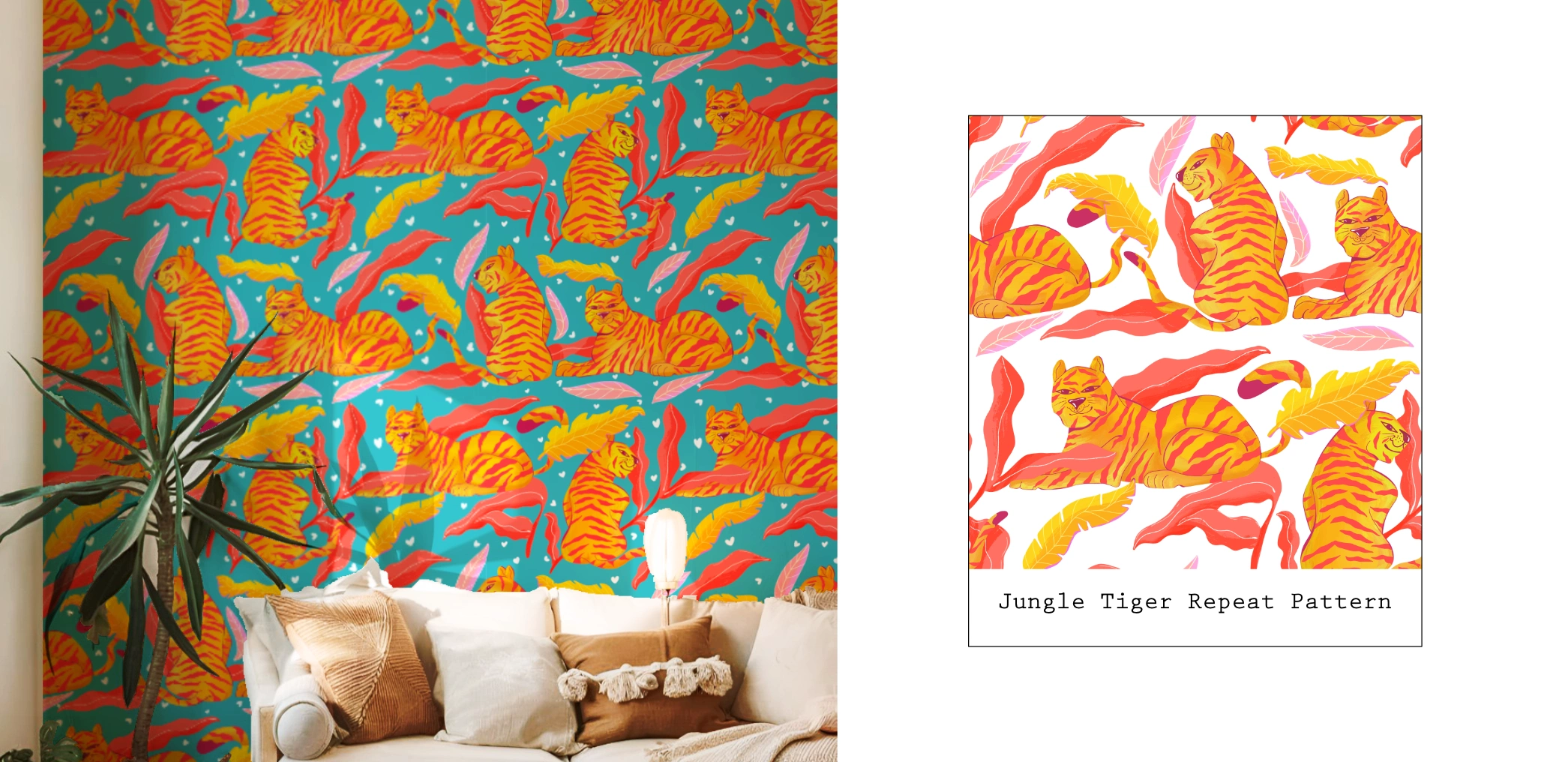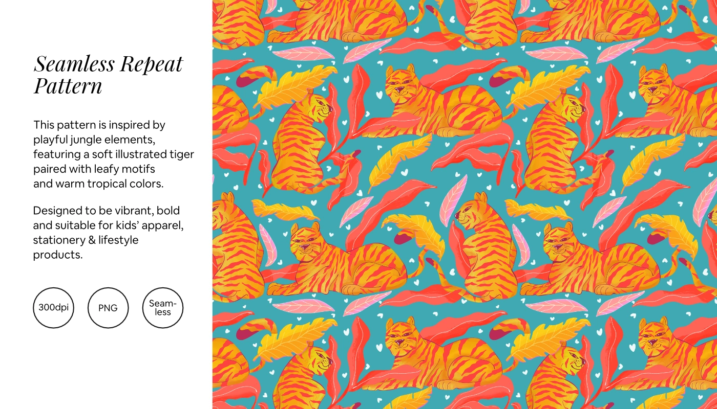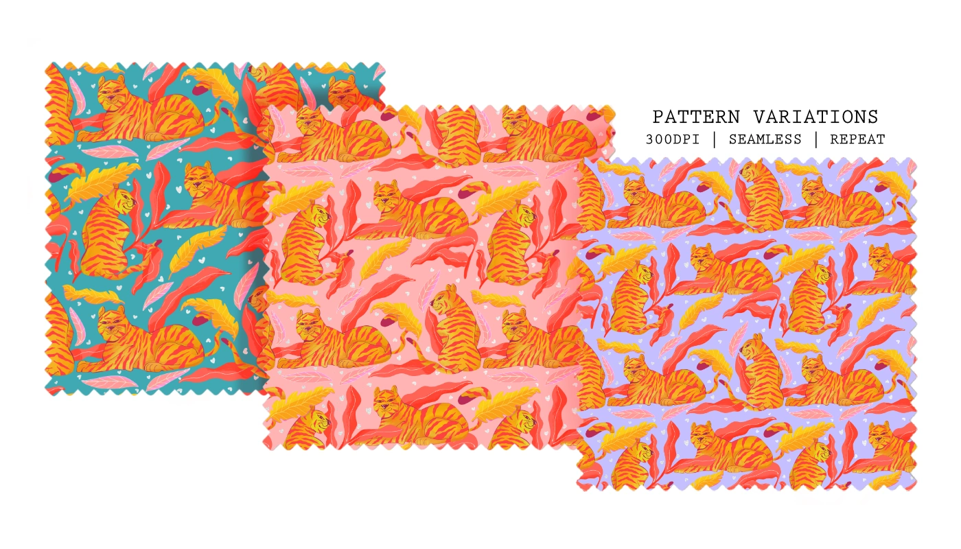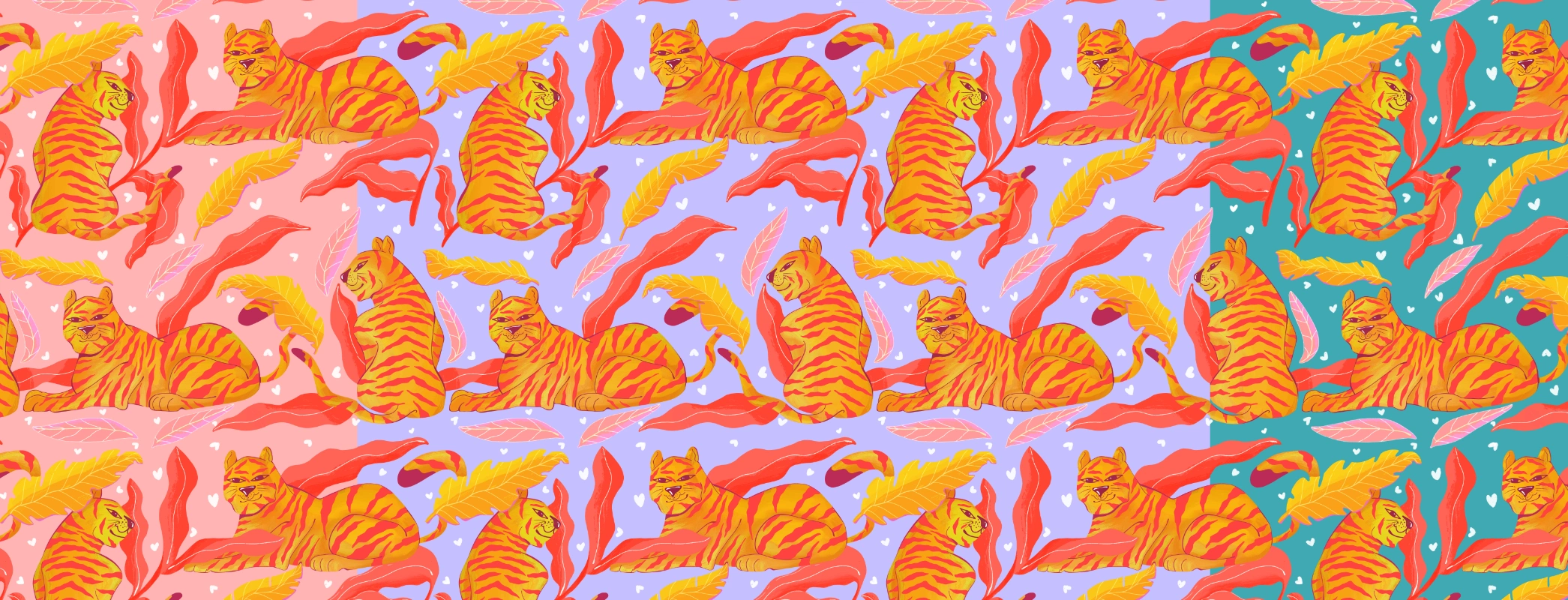 Tiger-themed surface pattern design with hand-drawn motifs and bold colors. More patterns & characters: www.madebyshreya.com