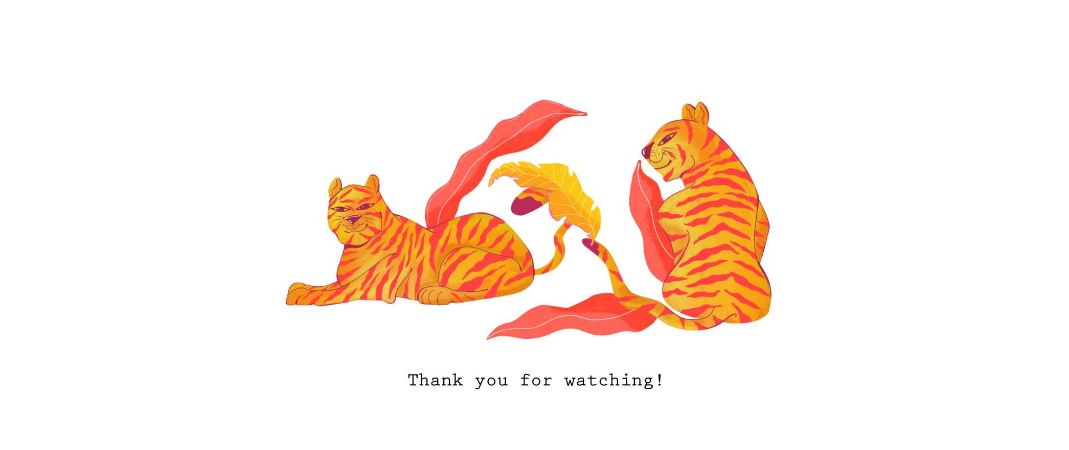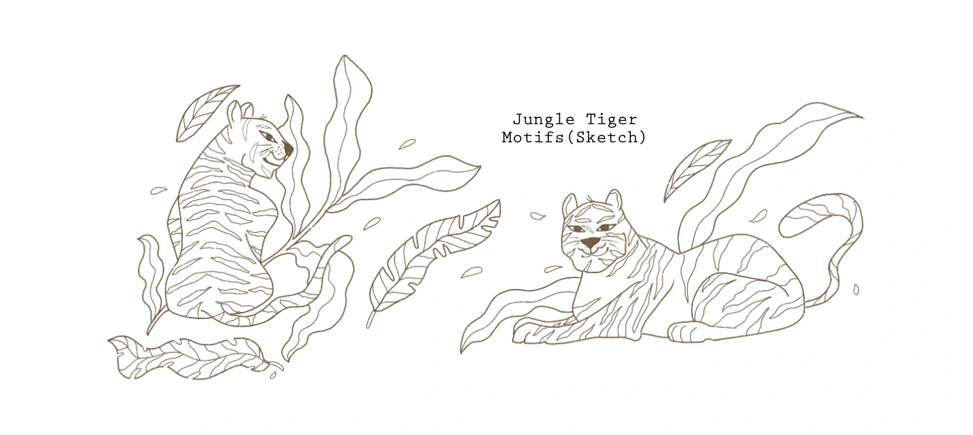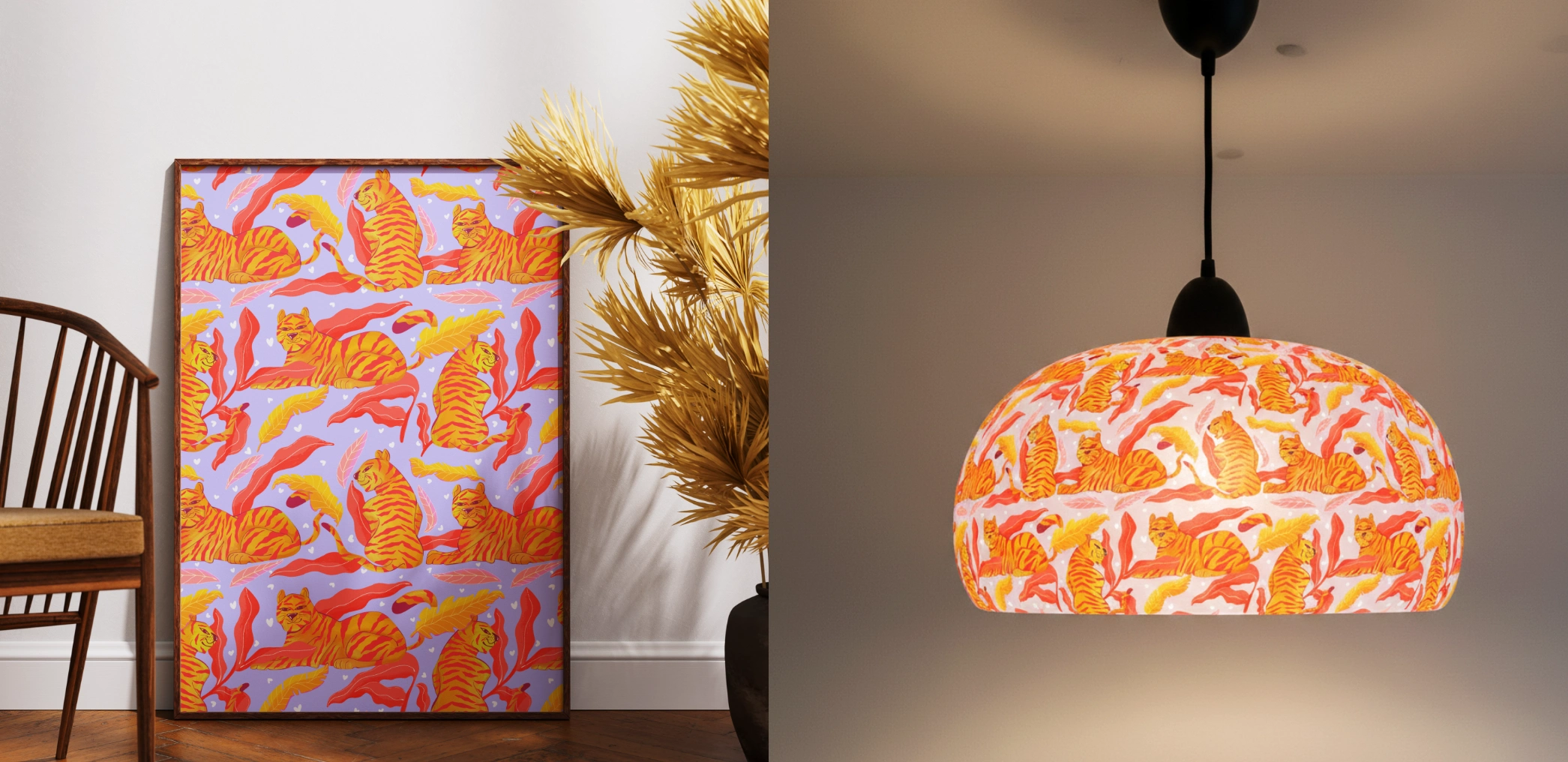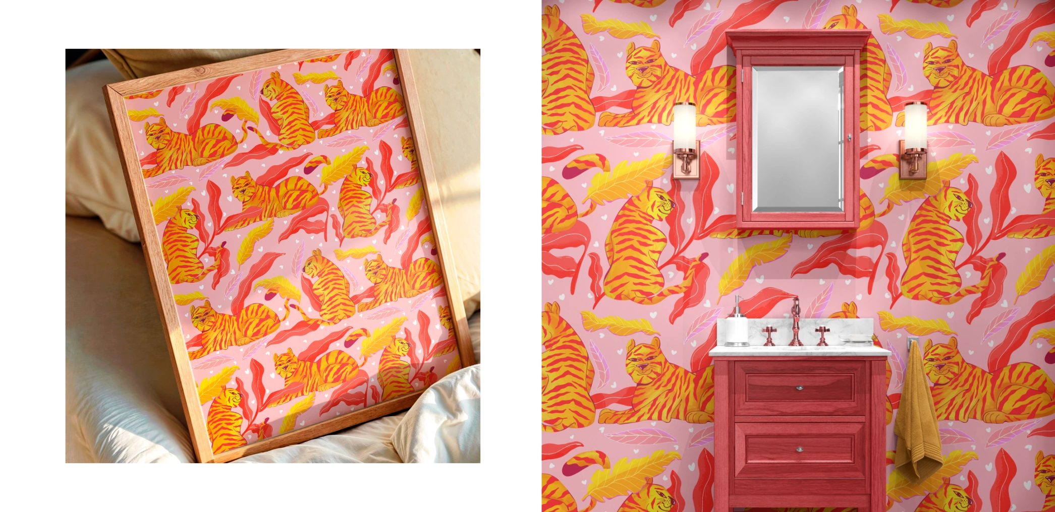 Tiger-themed surface pattern design with hand-drawn motifs and bold colors. More patterns & characters: www.madebyshreya.com