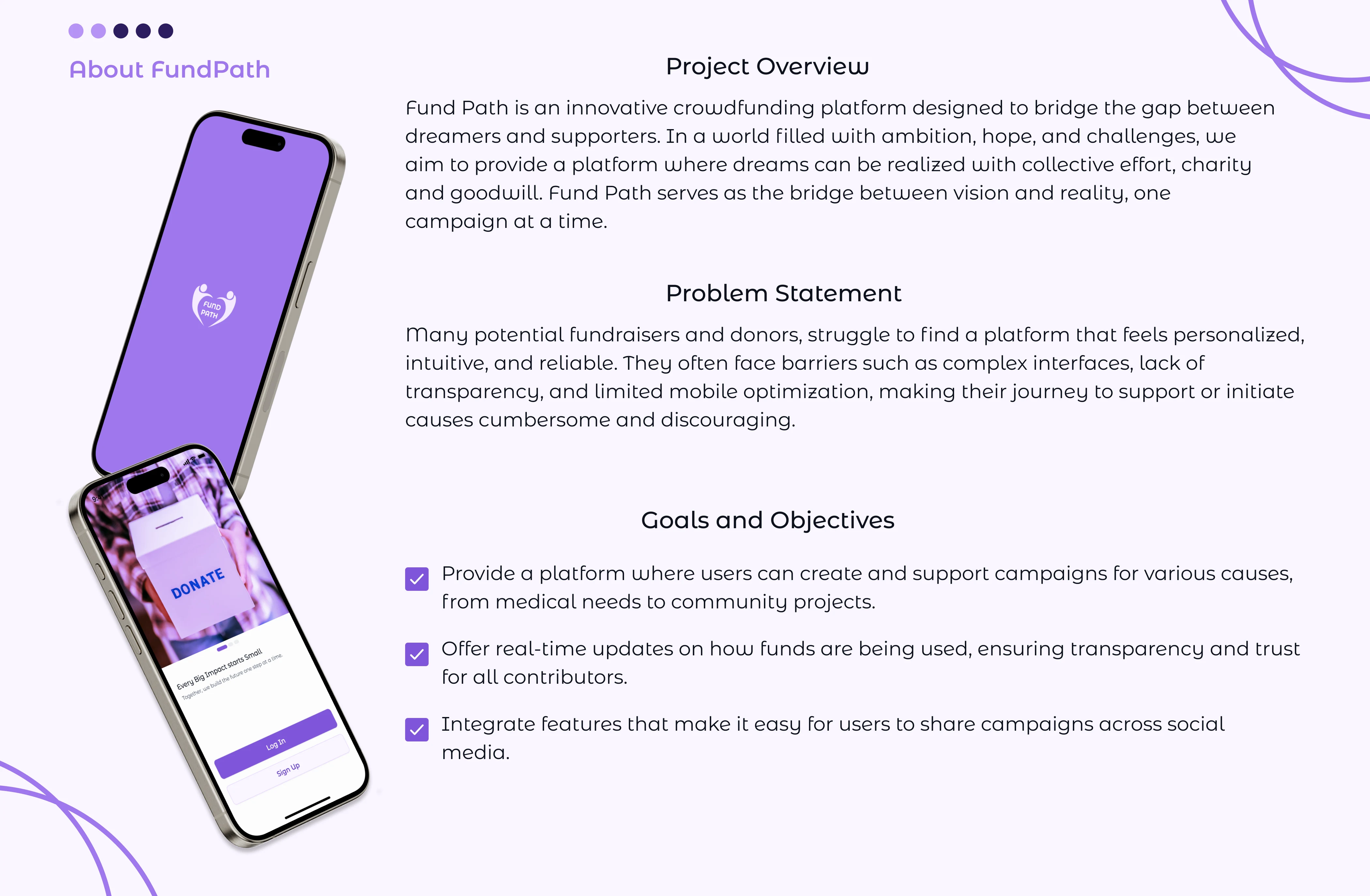 Fund Path is an innovative crowdfunding platform designed to bridge the gap between dreamers and supporters. In a world filled with ambition, hope, and challenges, we aim to provide a platform where dreams can be realized with collective effort, charity and goodwill. Fund Path serves as the bridge between vision and reality, one campaign at a time.